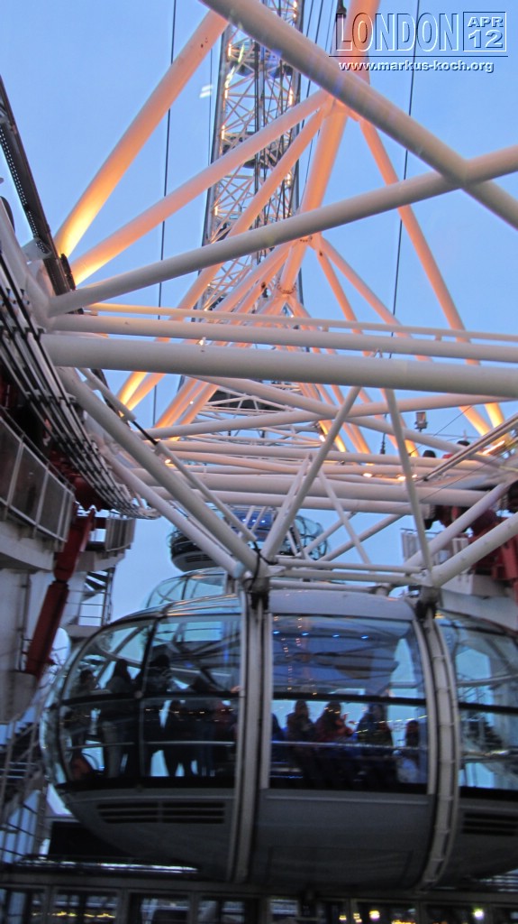 Nachdem wir uns frisch gemacht haben ging es mit der U-Bahn zum London Eye. Hier htten wir Fast-Tickets bereits im Vorverkauf um uns Zeit zu sparen. Um ca. 20 Uhr hoben wir ab um mit dem momentan größten Riesenrad Europas zu fahren. Ein fantastischer Blick über die beleuchtete Stadt, ganz besonders auf Big Ben & Houses of Parliament.