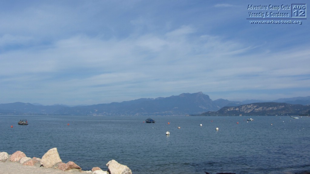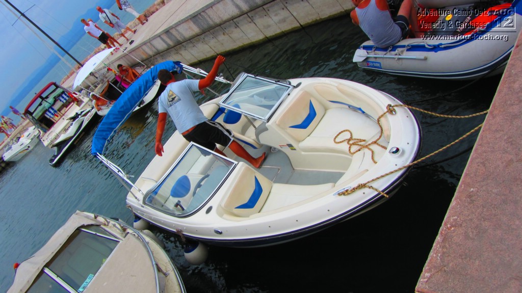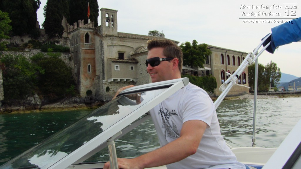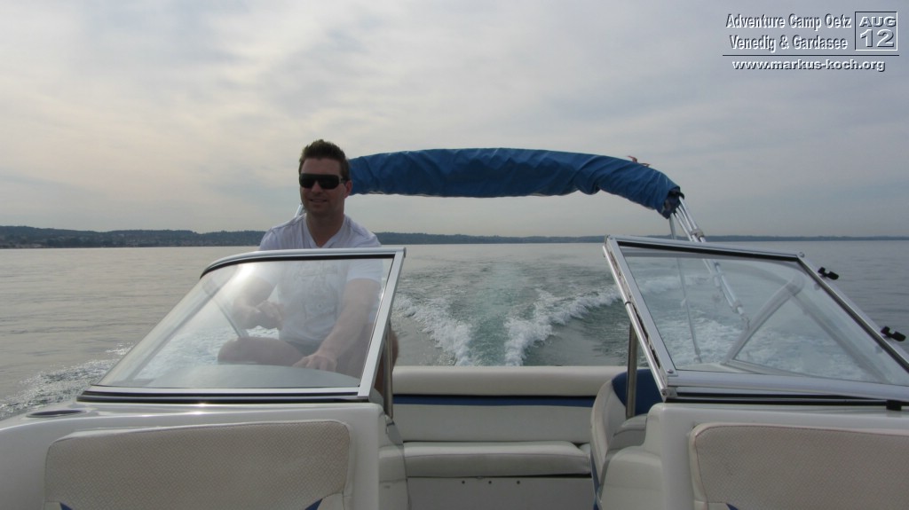 Für den Donnerstag habe ich uns bei Gardacharter direkt im Hafen vor der Tür in Lazise ein Motorboot gemietet – Eckdaten: Bayliner 205 Bowrider, Länge: 6,22 m, 220 PS, 300 €/Tag+100 € Spritkosten. Wunderbar endlich wieder mal mit einem Boot zu fahren.