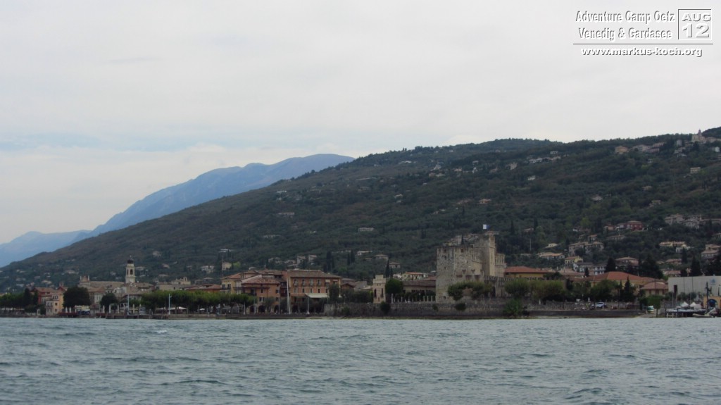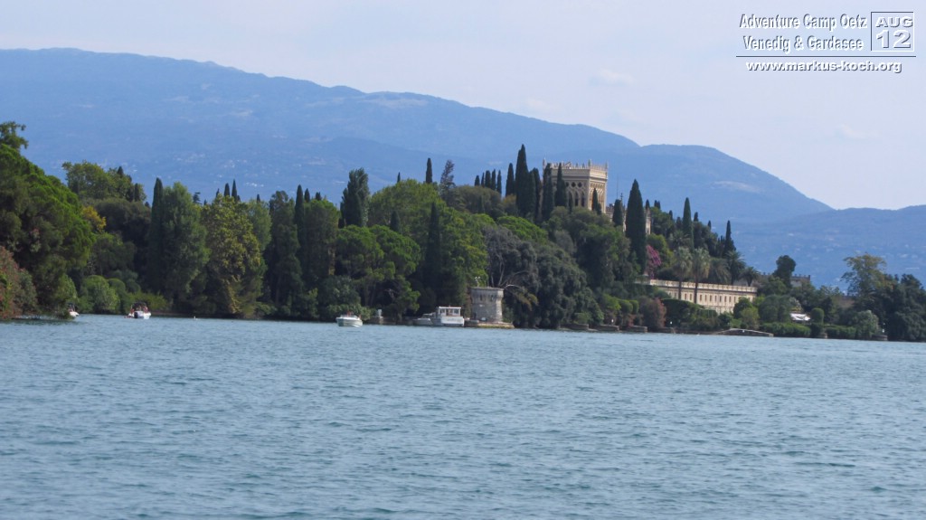 Wir sind von Lazise an der Küste entlang gefahren: Lacando San Vigilio (sind aber nicht an Land), Torri del Benaco, dann rüber zum Westufer (ganz schöne Wellen durch die Fallwinde aus dem Norden!!!): Toscolano Maderno, Gardone Rivera, Salo bis dann zur Insel „Isola del Garda“ mit Blick auf die wunderschöne Villa. Dort haben wir für eine Stunde geankert und es kam auch ab und zu die Sonne durch. Lecker haben wir unsere eingekaufte italienische Kost, die Sonne und die Ruhe genossen. Herrlich! Leider kamen etwas dunkle Wolken und wir sind lieber wieder auf die Ostseite zurück gefahren. Bei zu viel Wind aus Norden, sperrt das Amt öfters den See zum überqueren!