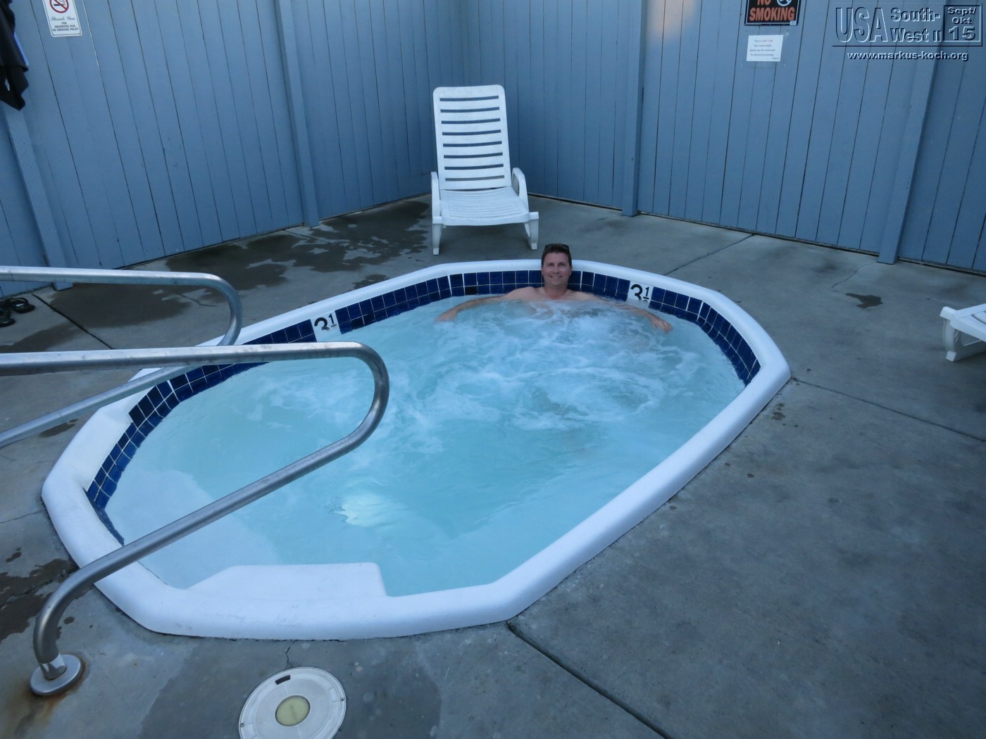 Zurück am CG ist Marie mit Luca auf den Spielplatz und ich in den Hot Tub – super hot war der 🙂 Sabine hat am RV dem Sonnenuntergang zugeschaut.