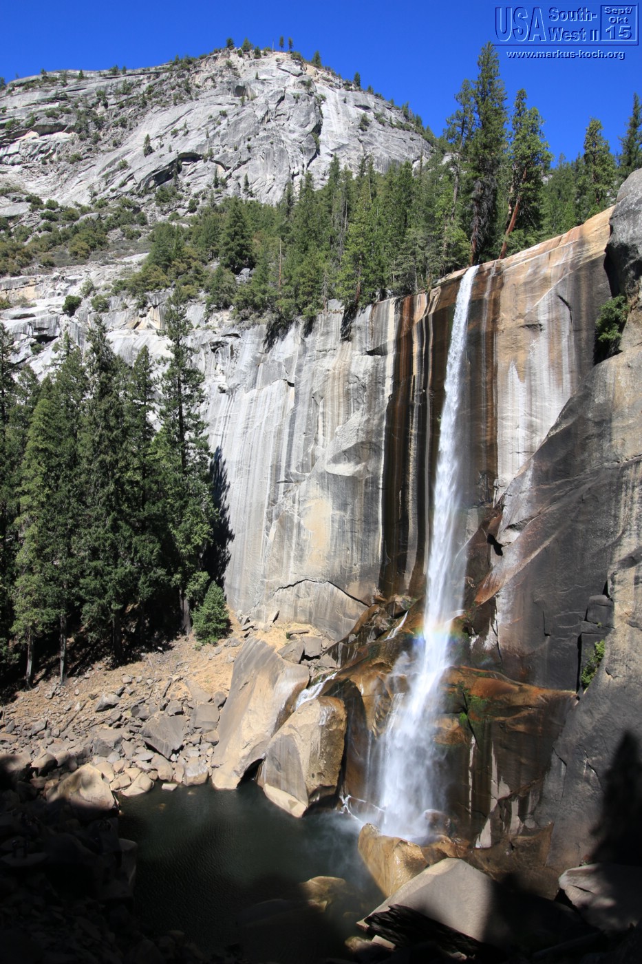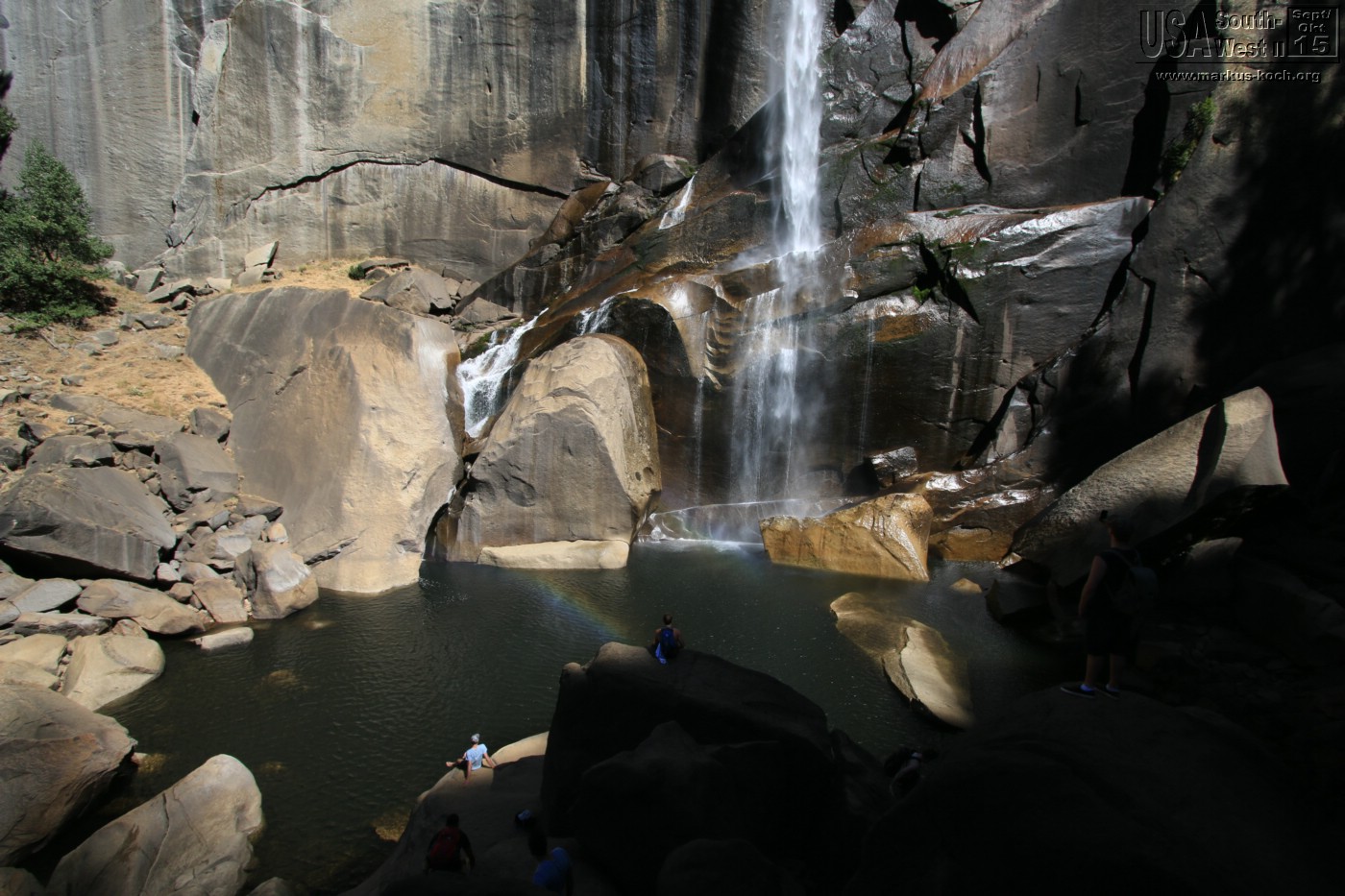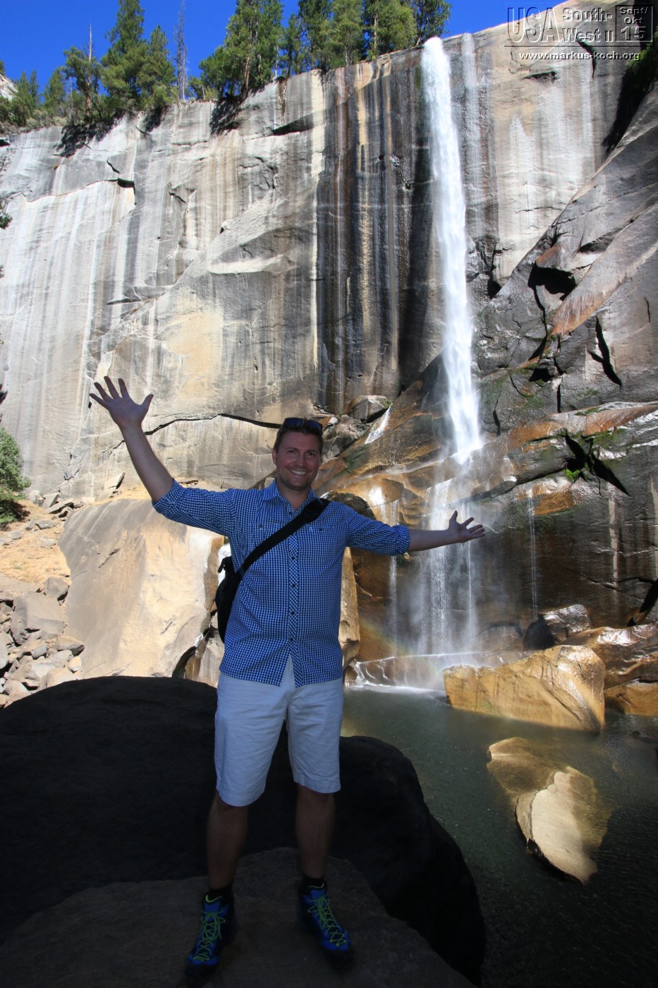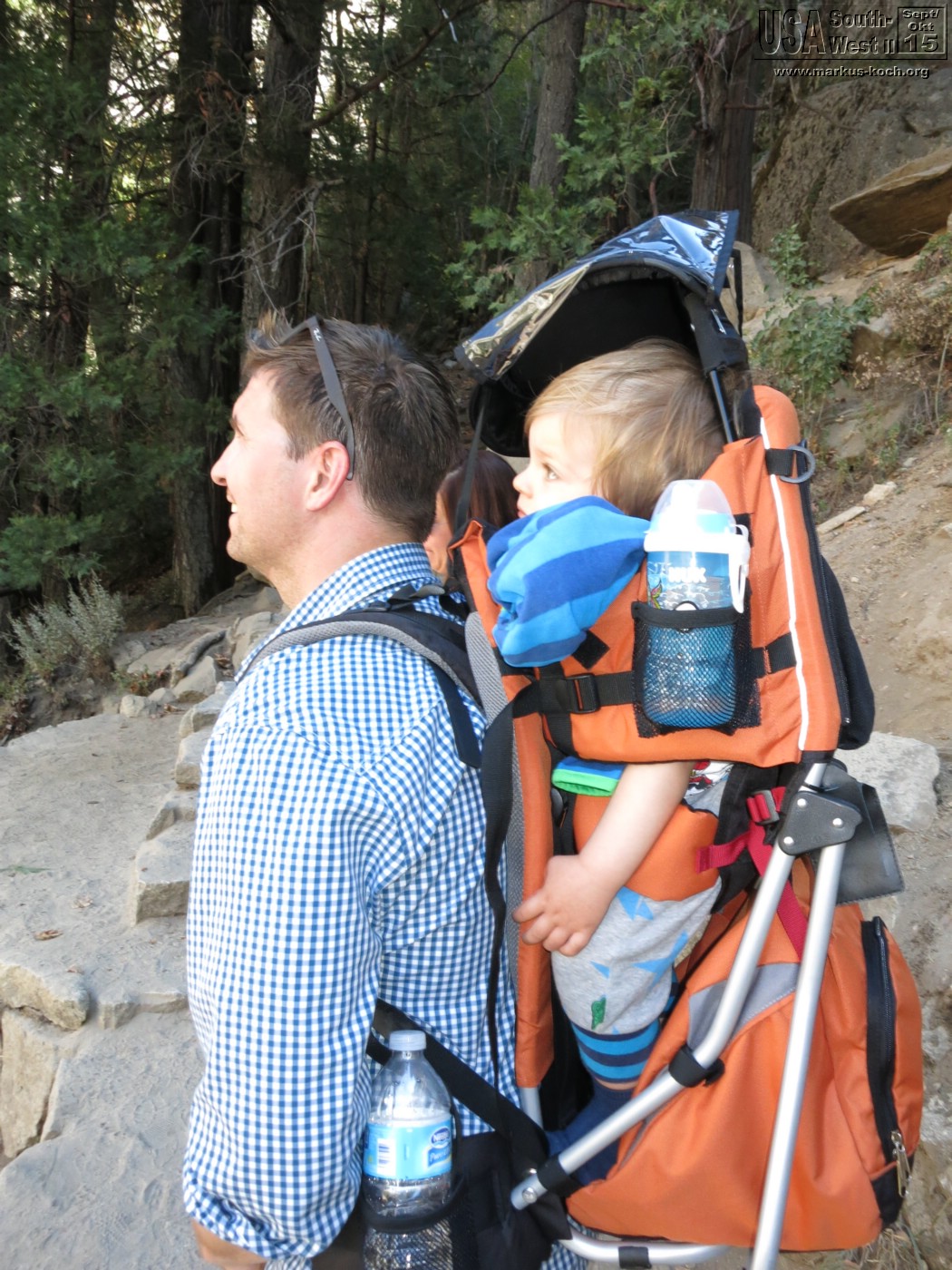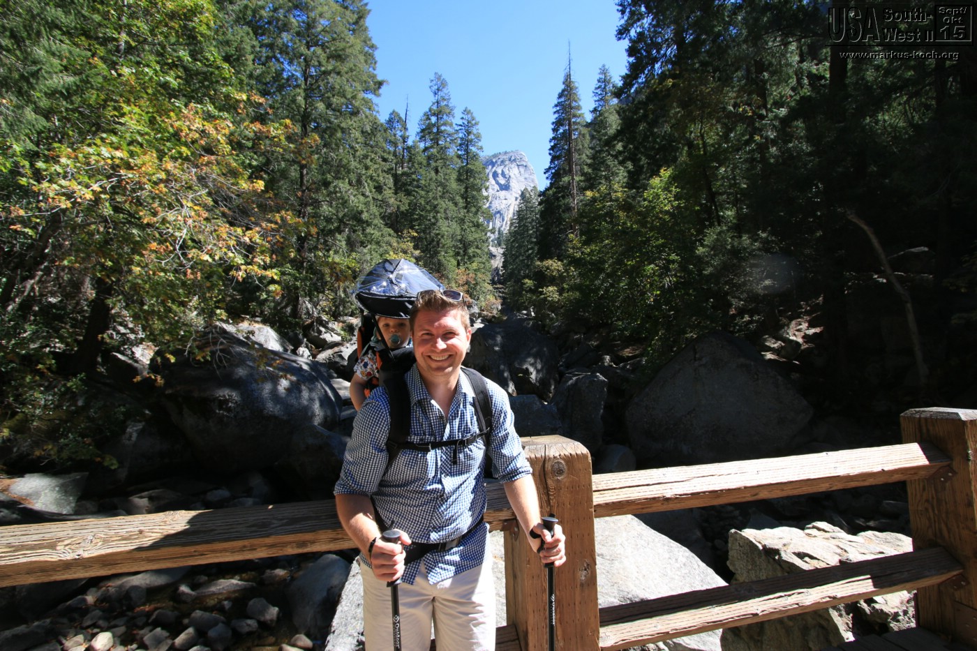Nach leckerem Frühstück im WoMo parkten wir dieses an einem Trail-Parkplatz um die Ecke vom Upper Pines CG. Von da wanderten wir mit Luca in der Kraxe auf dem Mist-Trail zu den Vernal Falls und noch ein Stückchen den Nevada Falls entgegen. Der Aufstieg war mit 600 – teils steilen aus dem Granit gesprengten – Treppenstufen nicht Ohne! Aber der Ausblick auf die Wasserfälle war echt toll. Im Frühjahr ist es bestimmt noch eindrucksvoller, wenn richtig viel Wasser von oben kommt!