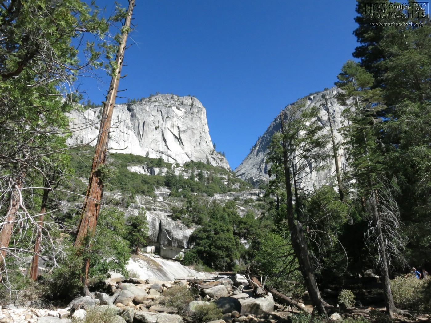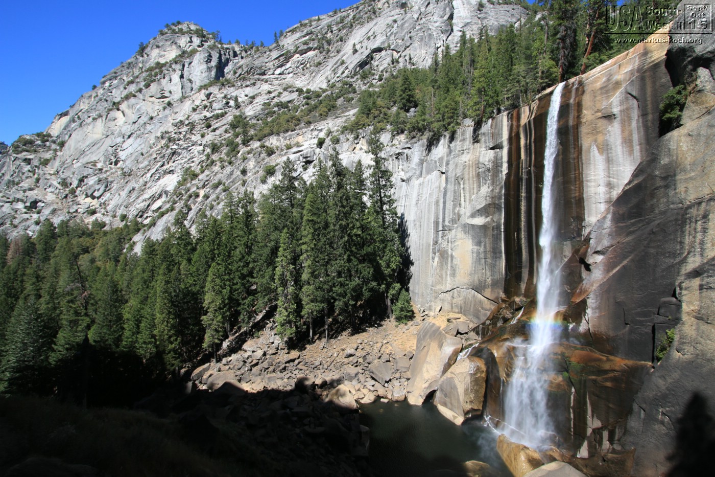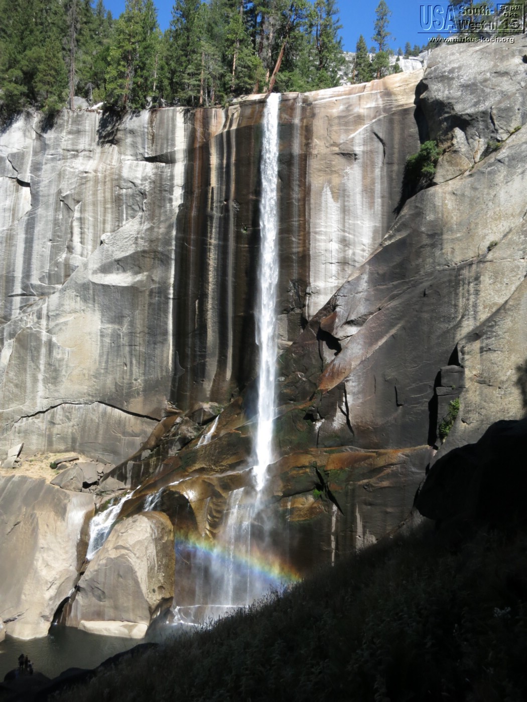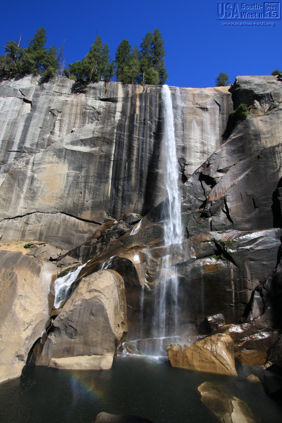 Nach leckerem Frühstück im WoMo parkten wir dieses an einem Trail-Parkplatz um die Ecke vom Upper Pines CG. Von da wanderten wir mit Luca in der Kraxe auf dem Mist-Trail zu den Vernal Falls und noch ein Stückchen den Nevada Falls entgegen. Der Aufstieg war mit 600 – teils steilen aus dem Granit gesprengten – Treppenstufen nicht Ohne! Aber der Ausblick auf die Wasserfälle war echt toll. Im Frühjahr ist es bestimmt noch eindrucksvoller, wenn richtig viel Wasser von oben kommt!