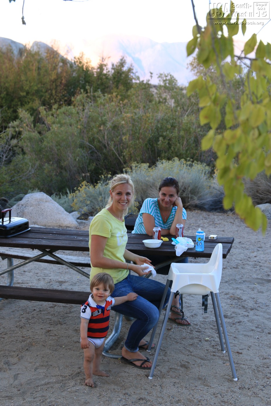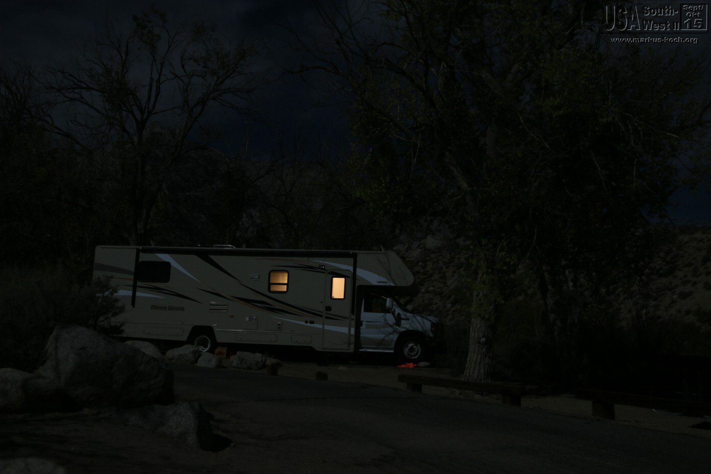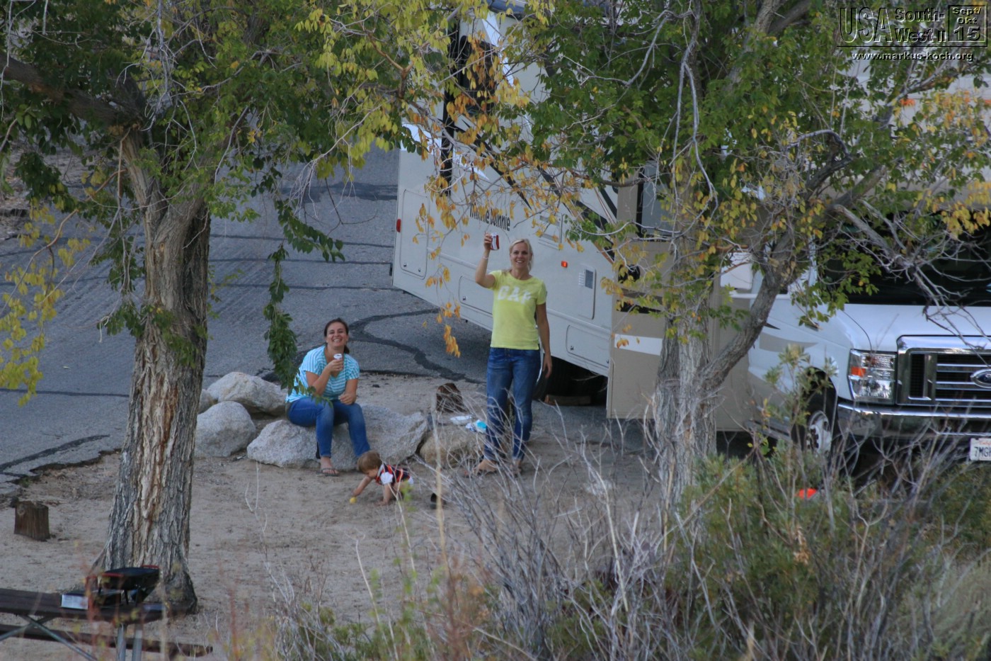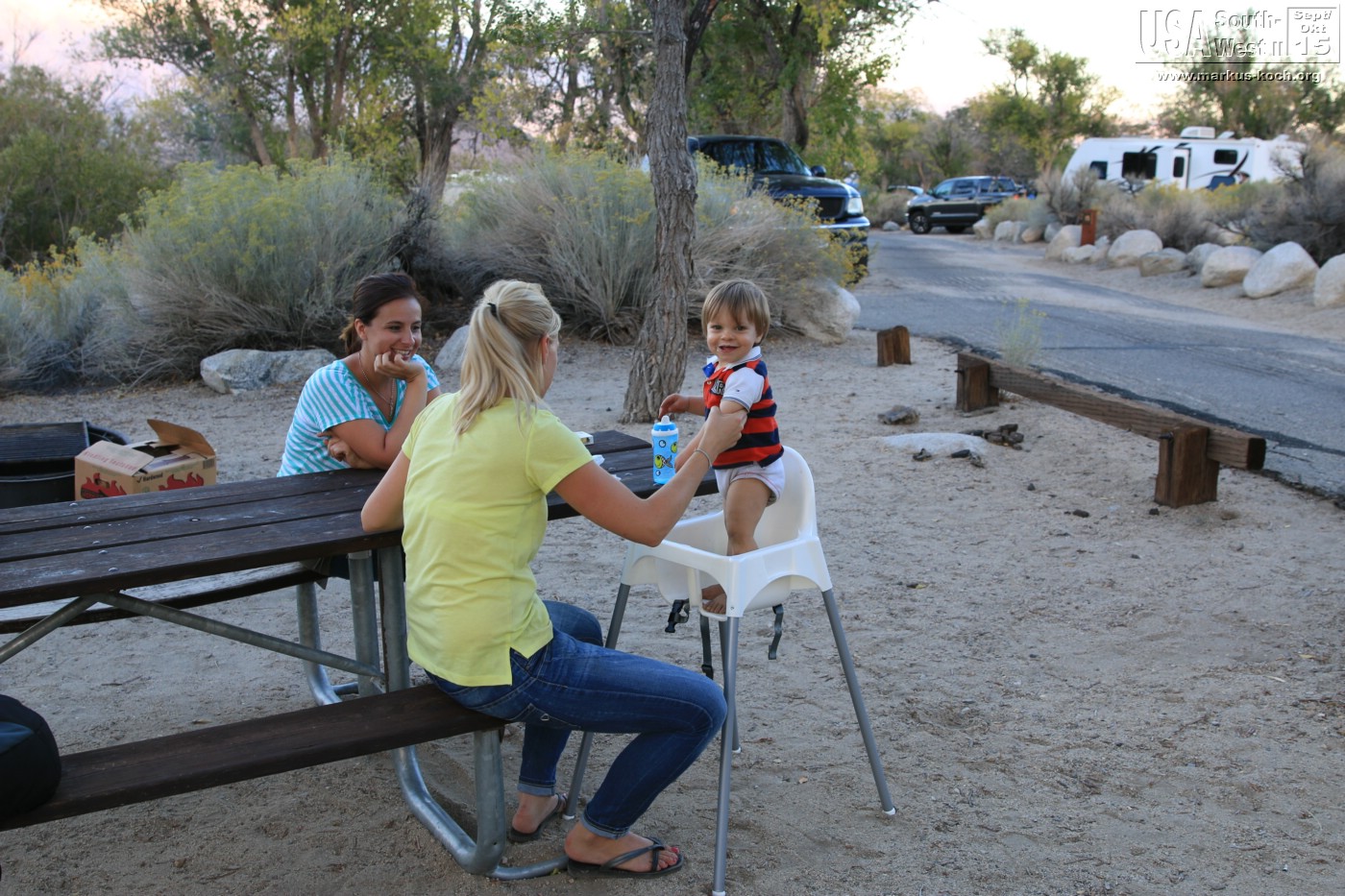 Durch Bishop und Lone Pine ging es durch die Alabama Hills auf direktem Weg zu unserem CG Lone Pine. Nach dem wir das RV gelevelt hatten konnten wir die Natur genießen. Hinter unserem RV ein Bach. Dann die Gebirgskette des höchsten Berges Mt. Whitney (4.400 m) der USA (außer Alaska). Bei Lagerfeuer grillten wir mal wieder lecker Burger und haben die Abendstimmung des Vollmondes absolut genossen. Luca bekam seinen Gute Nacht Brei Outdoor, nachdem er die Site halb umgewühlt hatte 😉
