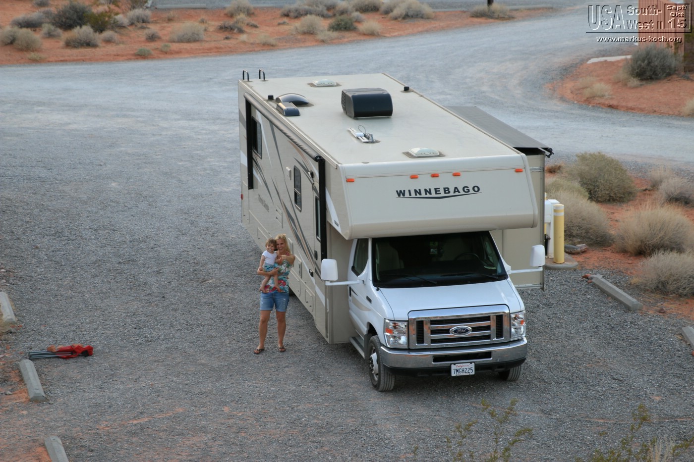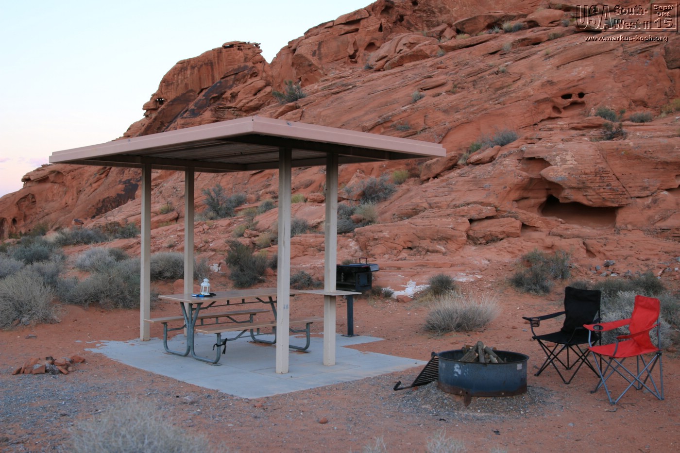 Die Wegstrecke war aber nicht allzu weit, nach 1,5 h waren wir im Valley of Fire angekommen. Alle möglichen Steinformen schimmern hier in wunderschönen Rottönen. Am CG des Tages, dem Atlatl-Rock-CG, konnten wir nicht reservieren. Es geht hier nach dem Prinzip „first come, first serve“. Wir suchten einen der um 13 Uhr noch vielen Plätze mit Blick aufs Tal aus und markierten diesen und bezahlten ihn per Umschlag (Vertrauenssache).