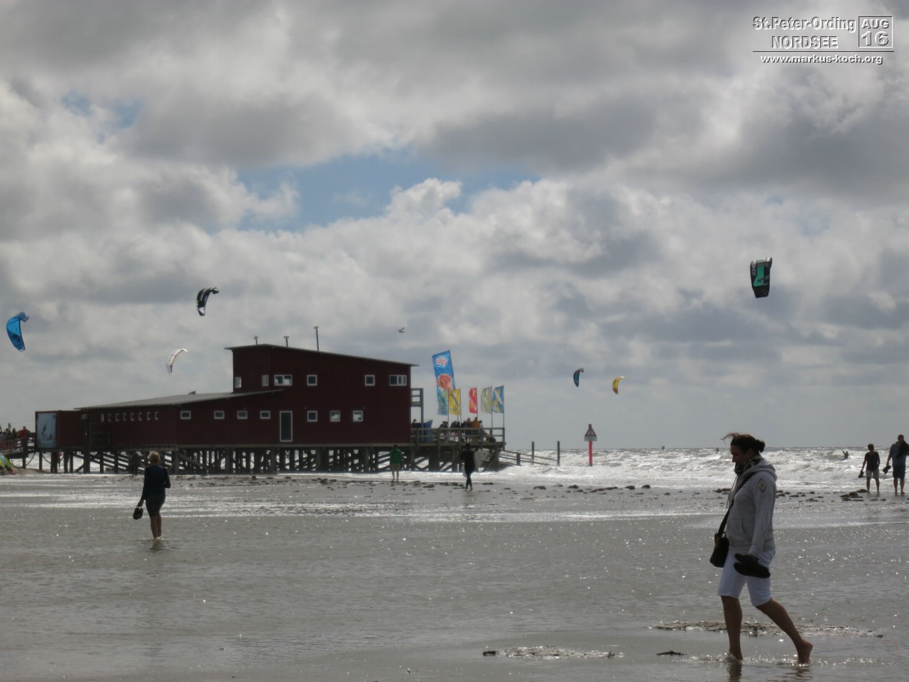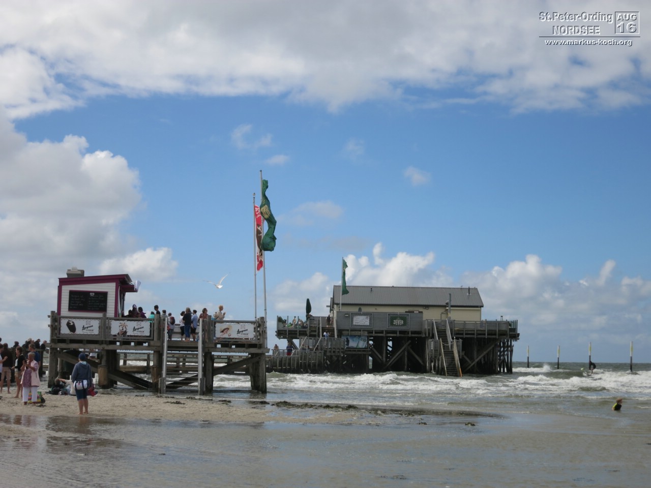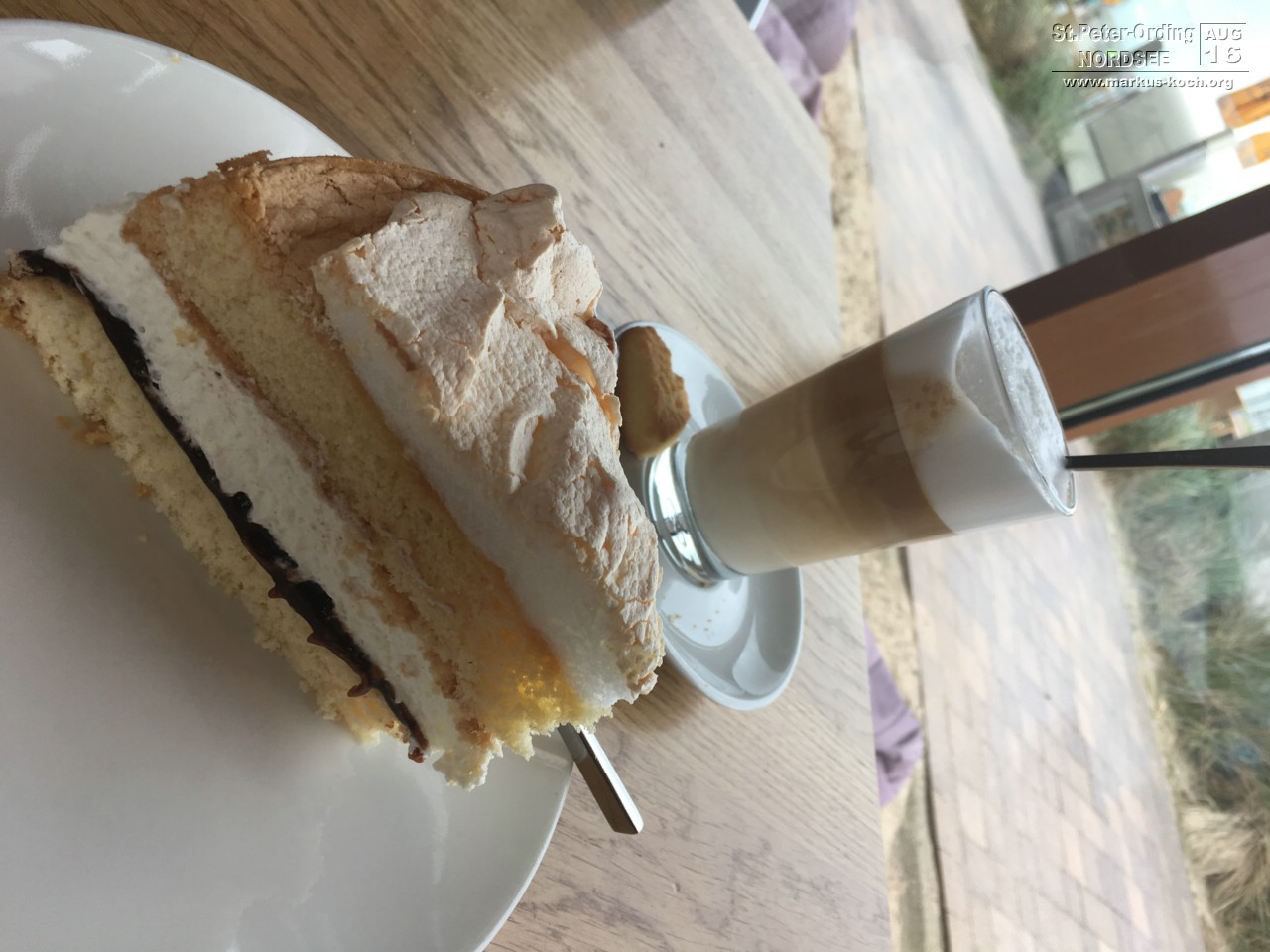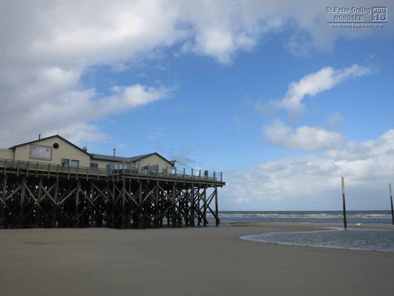 In Sankt Peter-Ording (SPO) angekommen konnten wir noch nicht in unsere Ferienwohnung, weswegen wir uns zu Kaffee in einem wunderschön angelegten Strandhaus entschlossen. Anschließend liefen wir auch gleich mal zum Strand von dort über einen Steg im Sand.