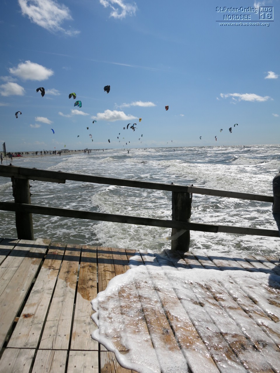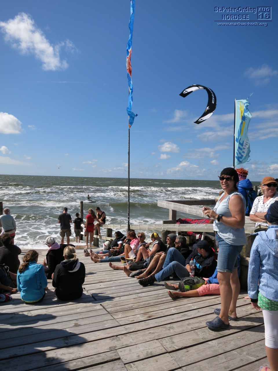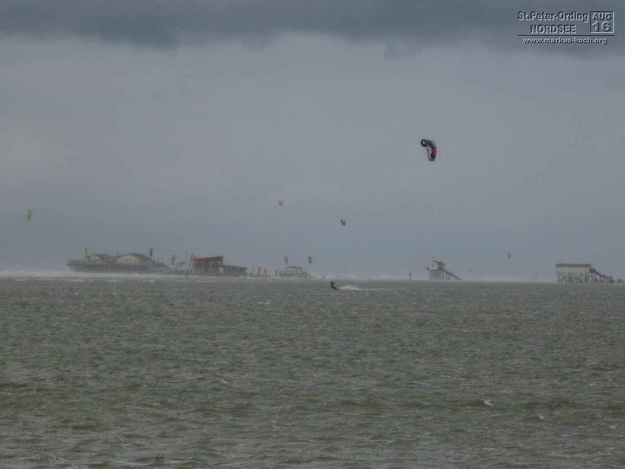 Als wir dann am Pfahlhaus waren, war die Flut doch schon sehr nahe, sodass wir entschlossen gleich wieder zu fahren. Das ganze Spektakel wollen wir uns nun vom Steg an der Strandpromenade ansehen.