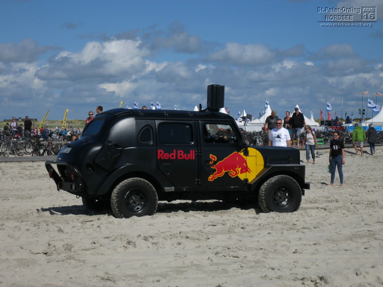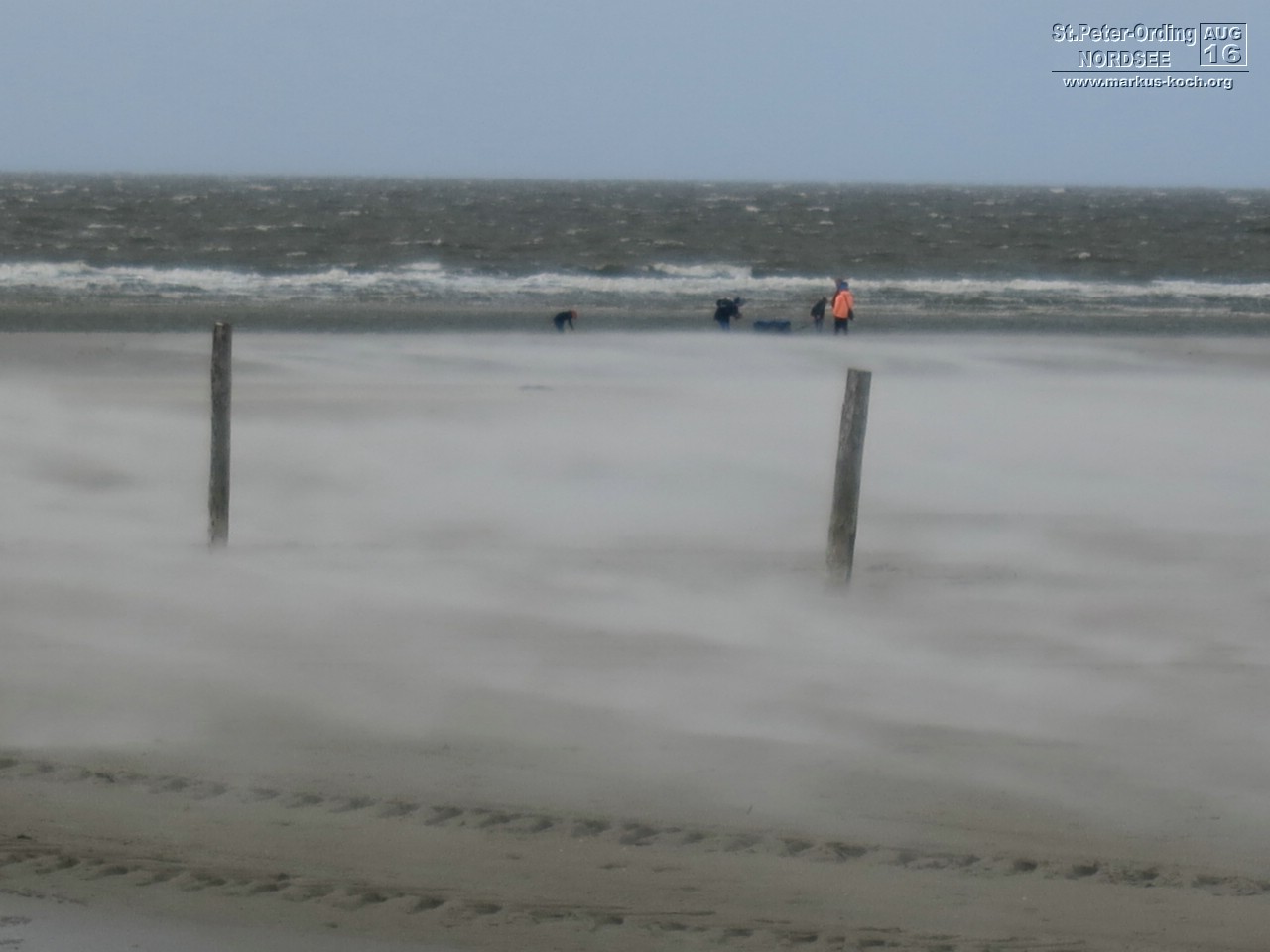 Nachmittags, als es besser schien, wollten wir zum Strand Bröhl, da dort wenig los ist und zum Pfahlhaus „Zur Silbermöwe“. Als wir am Strandparkplatz ankamen hieß es, wir müssen in 2 h das Auto spätestens weg haben, da dank Windstärke 8 die Flut schneller & höher als normal ankommt und den Parkplatz überfluten wird.