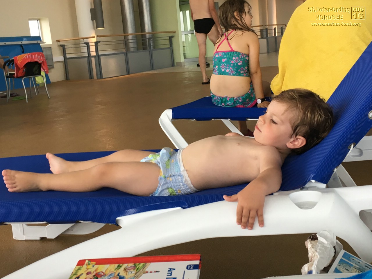 Leider war das Wetter heute mehr als mies und so war heute der Tag in der Dünen-Therme uns sicher. Luca gefiel es auch sehr gut im Wasser zu plantschen. Am meisten gefiel es ihm aber mit Schwimmflügel im tiefen Wasser. Ein Genuss für ihn.
