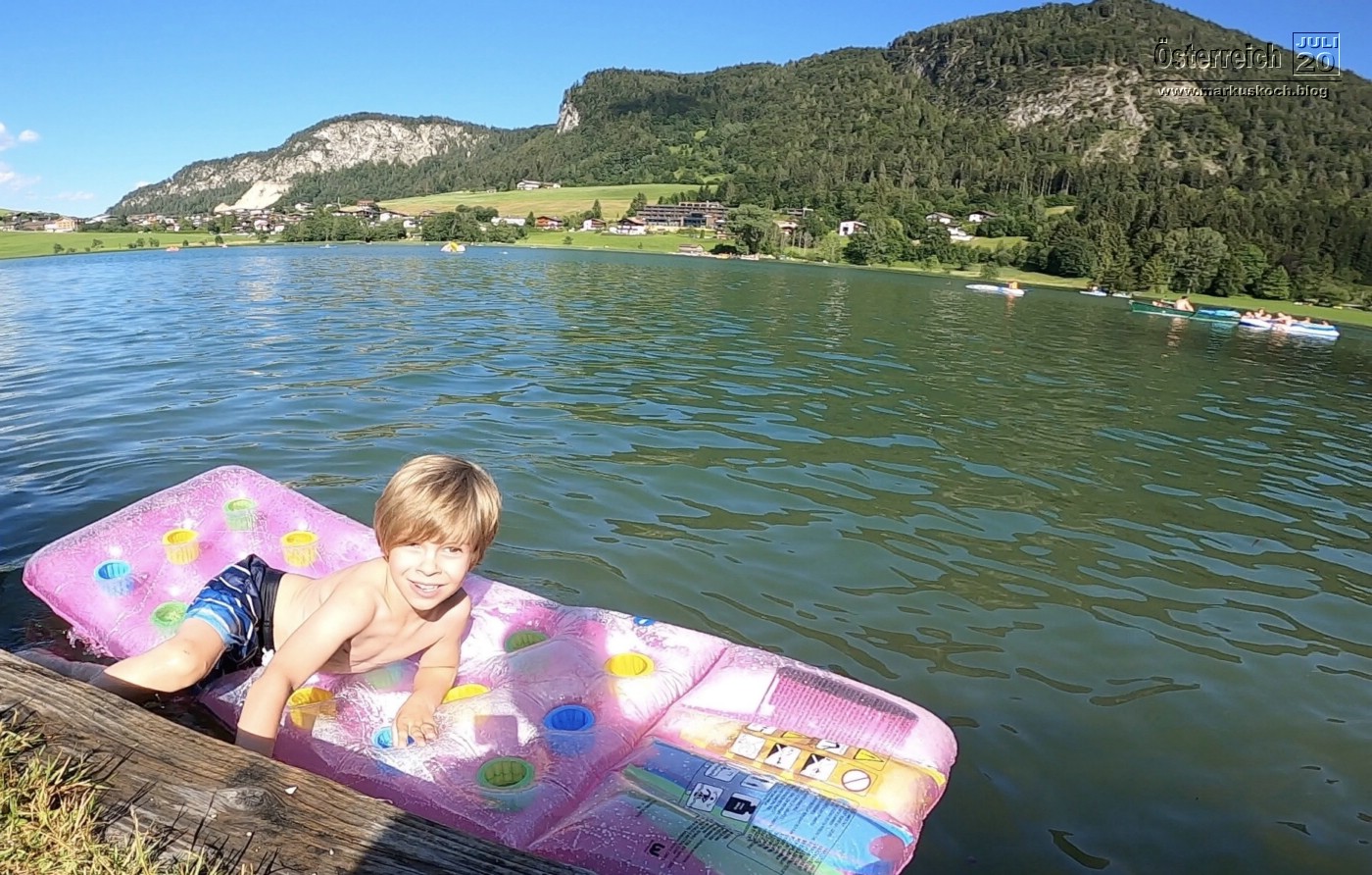 Am See wollte Luca unbedingt Boot fahren, aber da wir keines hatten oder ausleihen konnten, war Luftmatratze die Beste Wahl. Auch wenn es etwas frisch im See war.