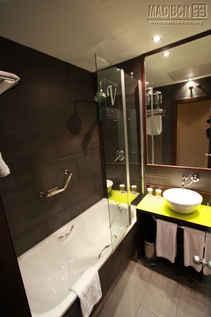 Check-In im Hotel Barcelo Raval & kurze Erholungspause. Das Hotel ist wie ein Zylinder als Designhotel aufgebaut. Sehr stylisch vom Fitnessstudio im Keller über den Ground Floor mit Lounge und Empfang, weiter über unser Zimmer im 9. Stock mit Blick über das Nord-Westliche Barcelona, bis hin über die Dachterasse im 11. Stock mit 360°Grad View über ganz BCN. Echt klasse! Bilder nur vom Hotel gibts unter den Bildern für diesen Tag zu sehen 🙂