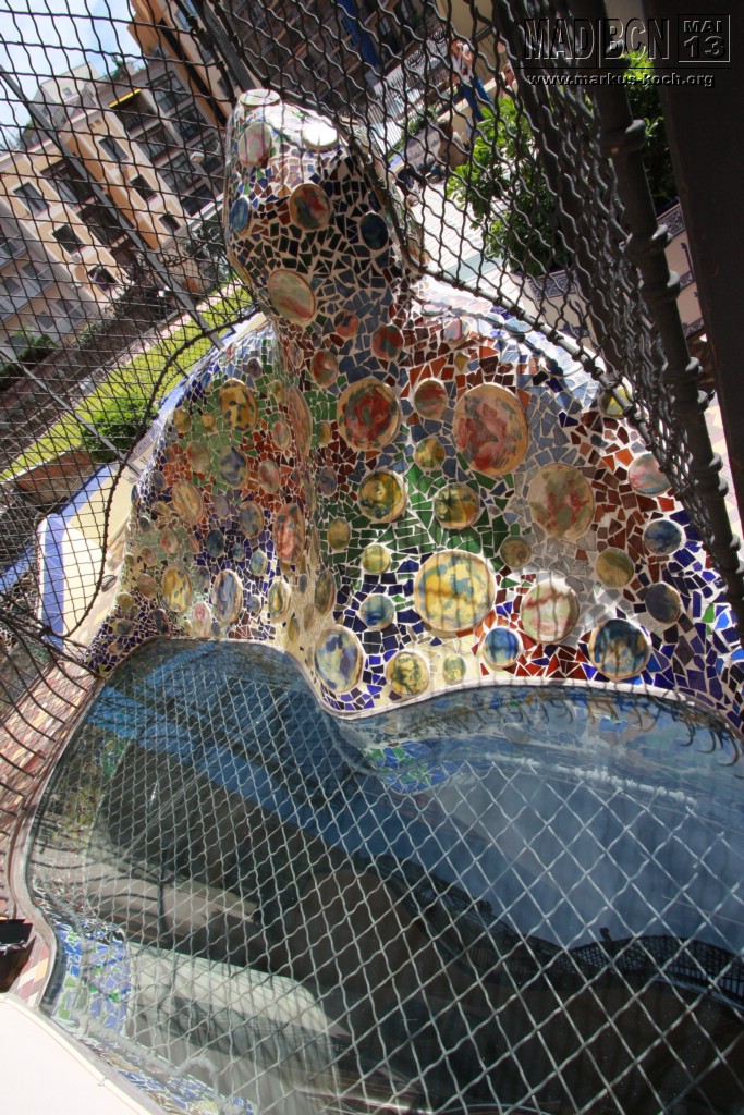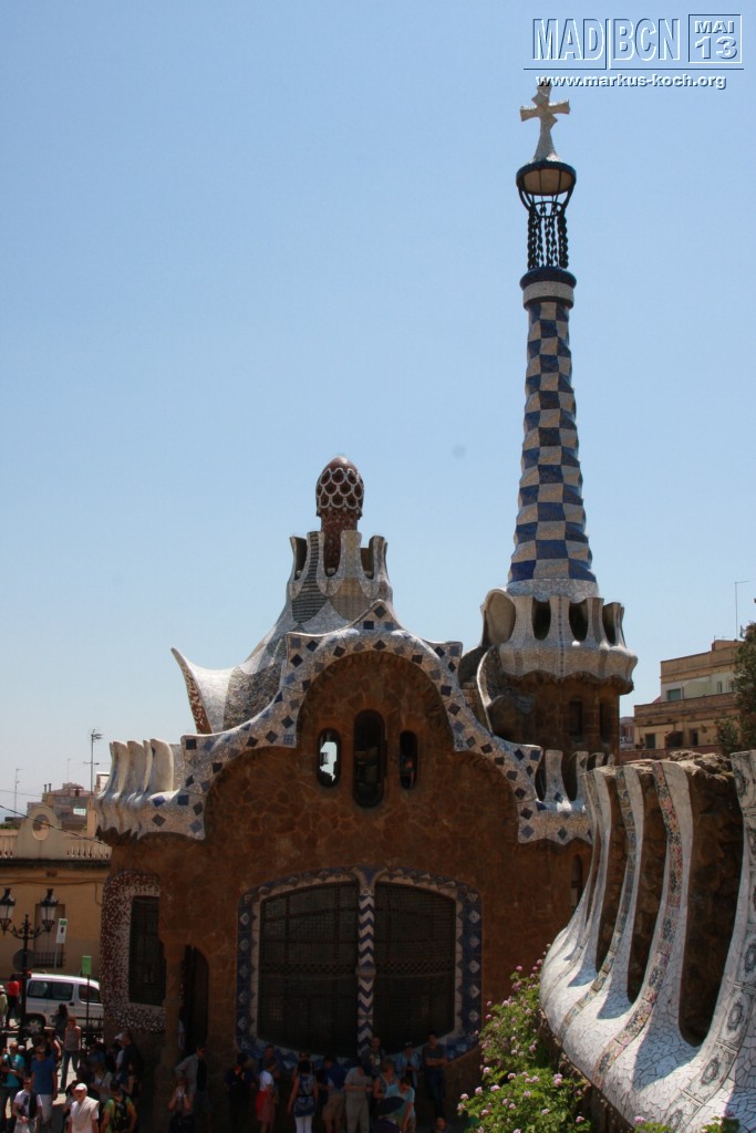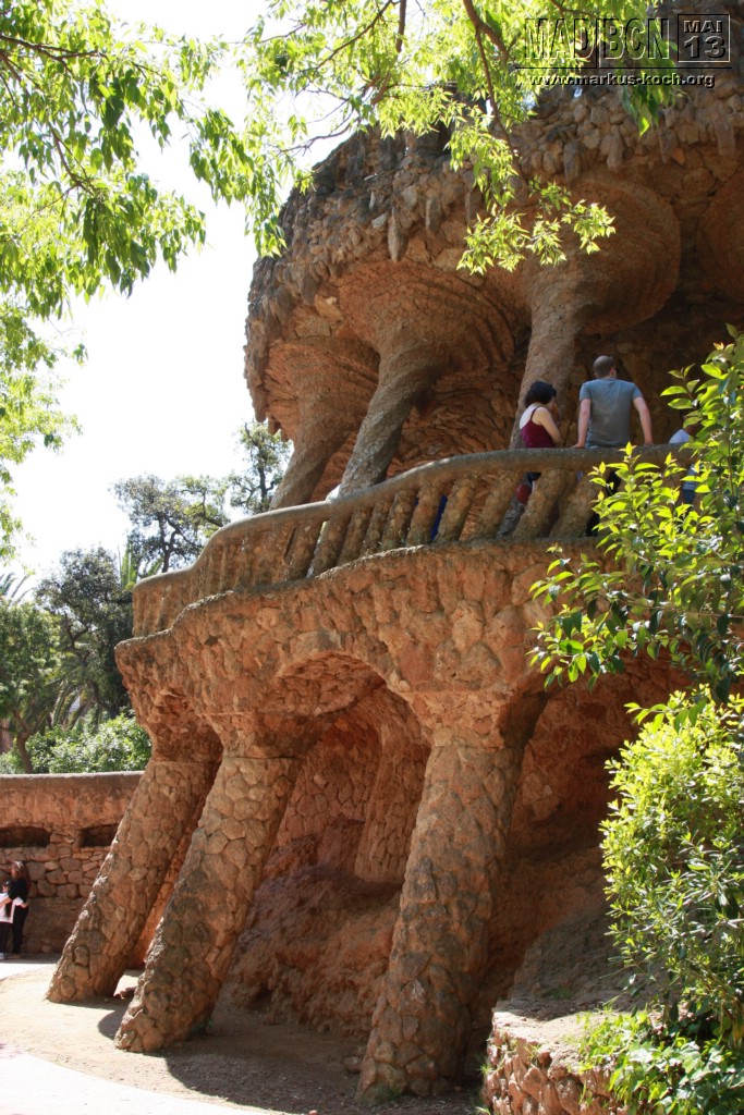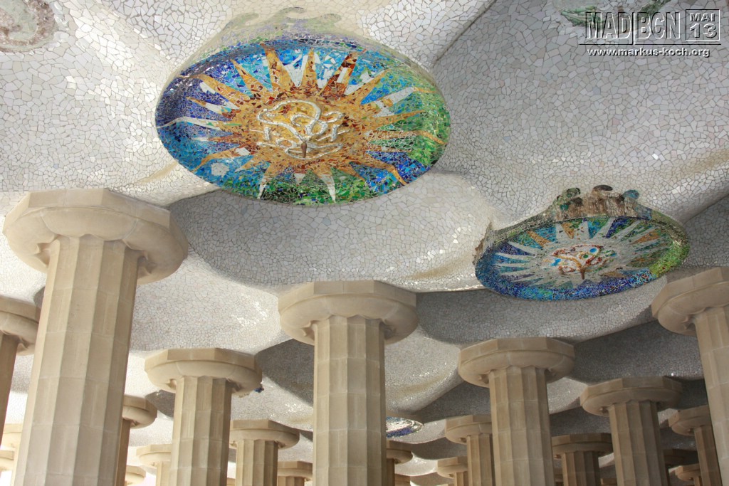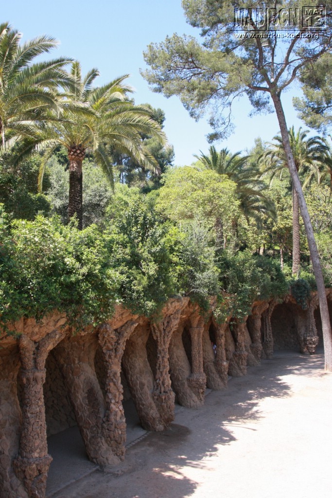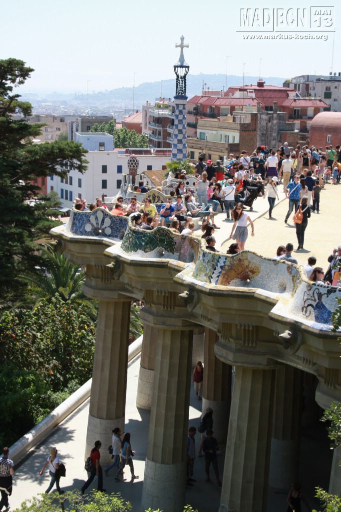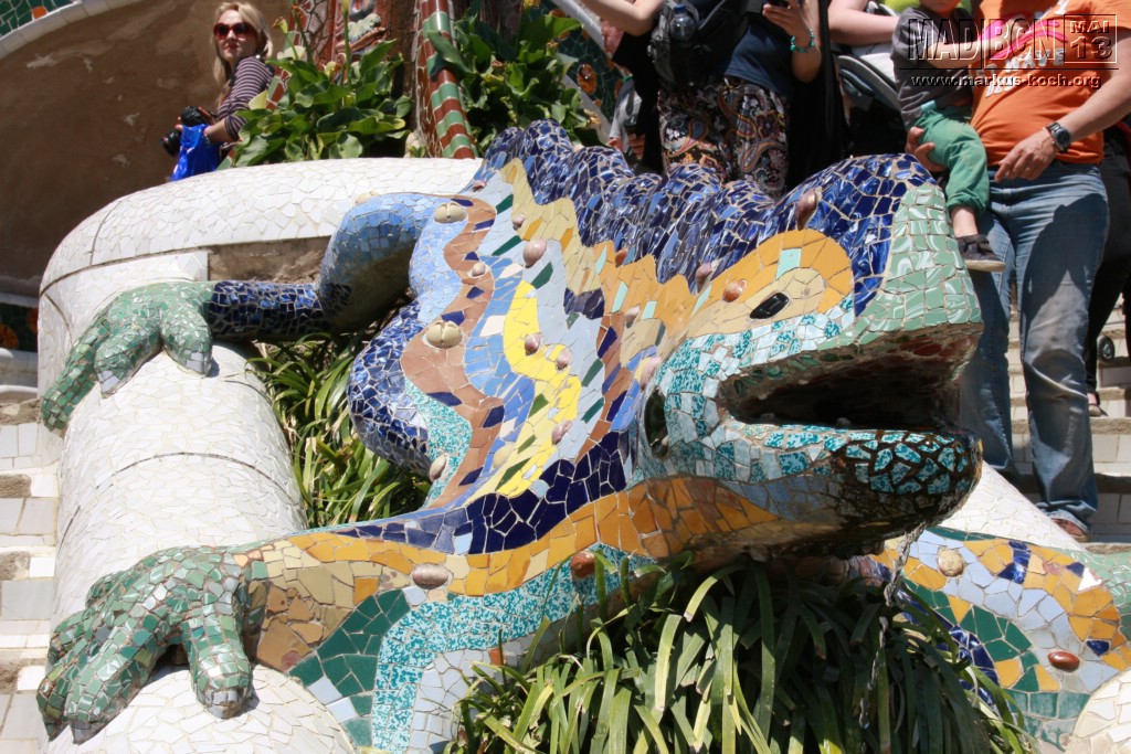Zuerst steuerten wir – immer noch mit dem Auto – den Park Güell an. Ein verspielter Garten nach der Fantasie Gaudi. Gaudi ist ein irrer Künstler mit sehr viel Einfallsreichtum gewesen, was man auch schon im Park Güell sehen kann. Das ganze Areal mit Mosaiken verzierten Skulpturen, einen Säuleneingang, der als Markthalle gedacht war, und die berühmte Schlangenbank (150m lang).