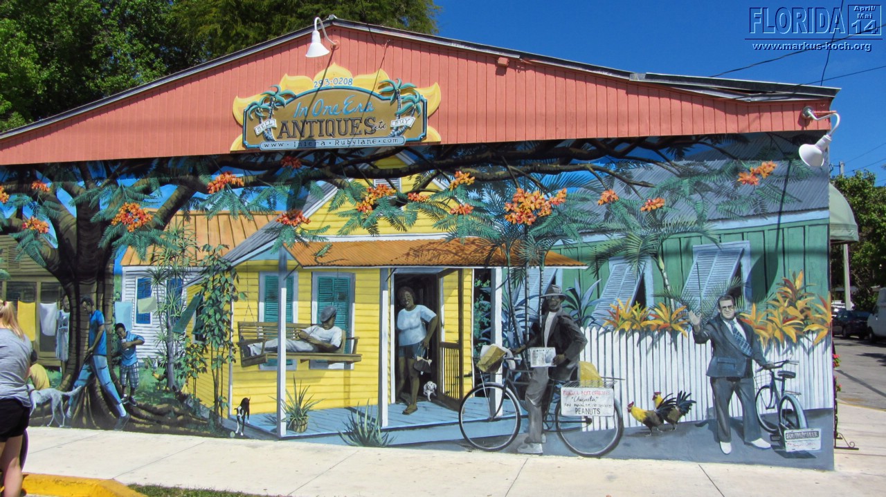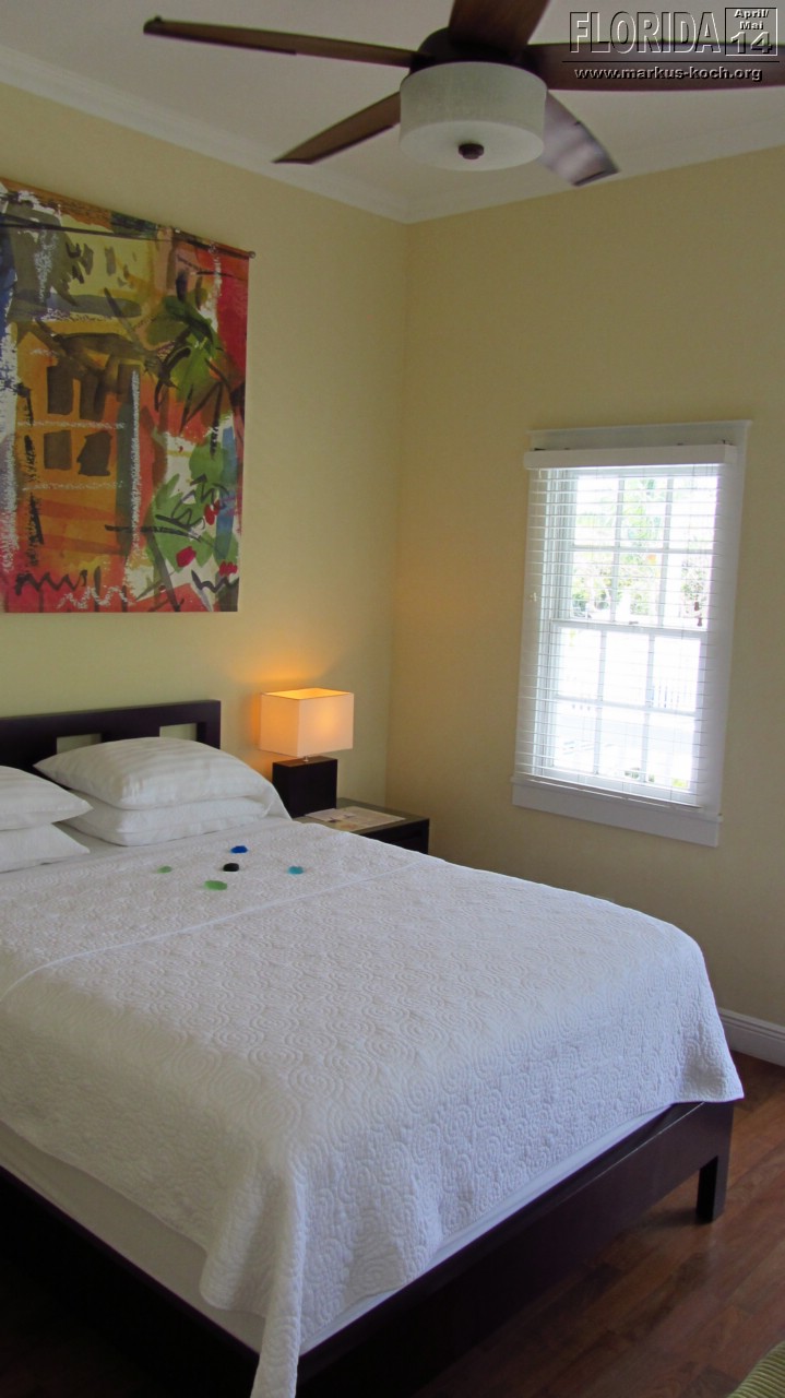 Da wir zeitig wach waren beschlossen wir vor dem Frühstück noch schnell mit den Fahrrädern zum Southernmost Point zu fahren, um den Fotoschlangen zu entfliehen. Nach dem leckeren Frühstück auf der Terrasse klapperten wir noch ein paar Hotspots ab: Lighthouse (super Blick von da oben über ganz Key West), Ernest Hemingway House (waren aber nicht drinnen), Fort Zachary Taylor Historic State Park (Fort errichtet 1845), Bahamas Village mit seinen Wandgemälden und einem echt coolem Restaurant/Bar „Blue Heaven“. Der Mojito um 12 Uhr Mittags bei dieser Hitze hat ganz schön gefetzt 😉