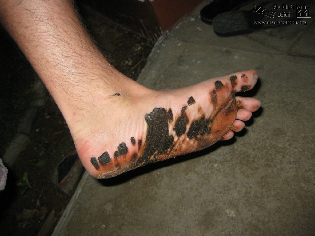 Anschließend hieß es nur noch Strand & Schnorcheln. Nach dem Abendessen auf der Terrasse des Resort-Restaurants bei Sternenhimmel liefen wir noch ein Stück am Strand entlang…. Leider war das im Nachhinein etwas ölig, da unsere Füße nur mit bestimmten Reinigungsmittel von der Rezeption sauber wurden. Im Golf von Oman lassen Frachter altes Öl ab und das war dann das Ergebnis. Ohne Spezialreinigungsmittel wäre das nur ganz schwer abgegangen…. Am nächsten Tag war das Thema Meer dann leider erledigt. Beim Schnorcheln – es waren aber kaum interessante Fische oder anders zu sehen – haben wir von dem Öl noch nichts gemerkt.