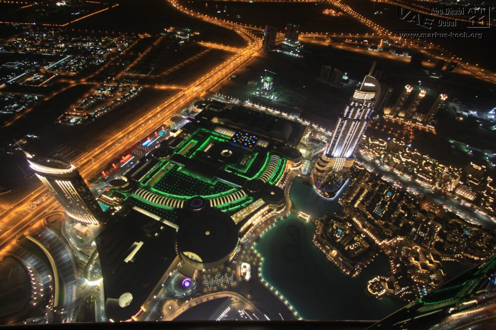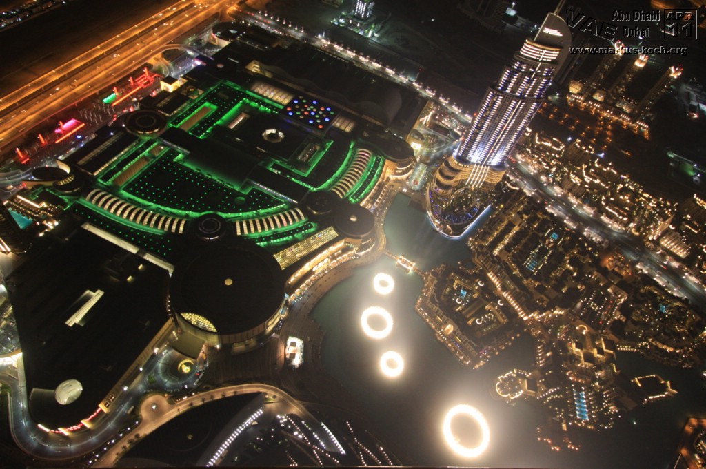Im Außenbereich der Mall war ähnlich wie vor dem Bellagio in Las Vegas ein sehr großer Wasserbereich in dem nach dem Takt der Musik ständig zwischen 18 und 23 Uhr Wasserfontänen direkt unterhalb des Burj Khalifa in die Luft „geschossen“ werden. Echt gut gemacht. Diese Fontänen (The Fountains) sieht man auch gut aus 452 Metern oberhalb.