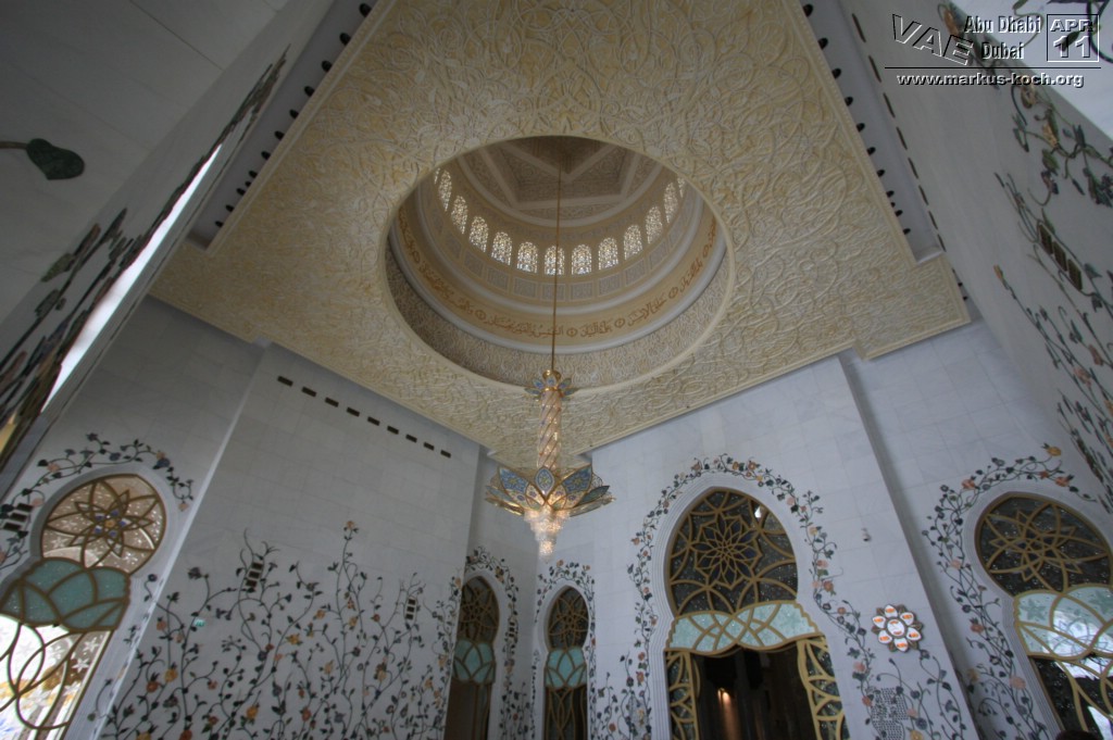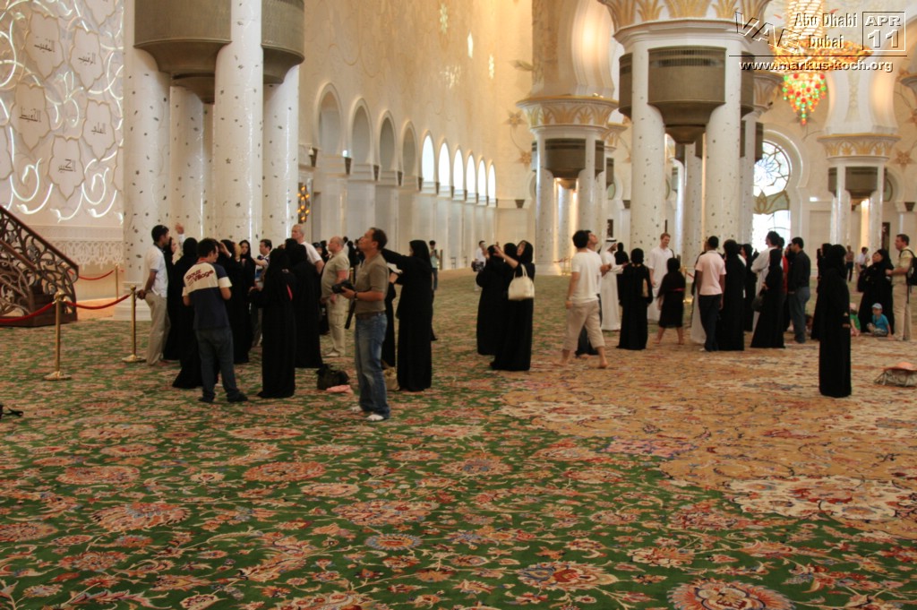 Der letzte Tag in den VAE begann mit dem Sightseeing-Highlight – der Sheikh-Zayed-Moschee von Abu Dhabi. Sie ist die weltweit drittgrößte Moschee. Wirklich beeindruckend dieses Bauwerk. Die Mädls haben eine schwarze Abaya (ein schwarzes Gewand mit Kopfbedeckung) tragen müssen; Männer mindestens lange Hose. Alle mussten wir zum Bestaunen barfüßig sein, um die riesigen Innenkuppeln mit deren super schweren und enorm großen, glitzernden Kronleuchtern zu sehen.