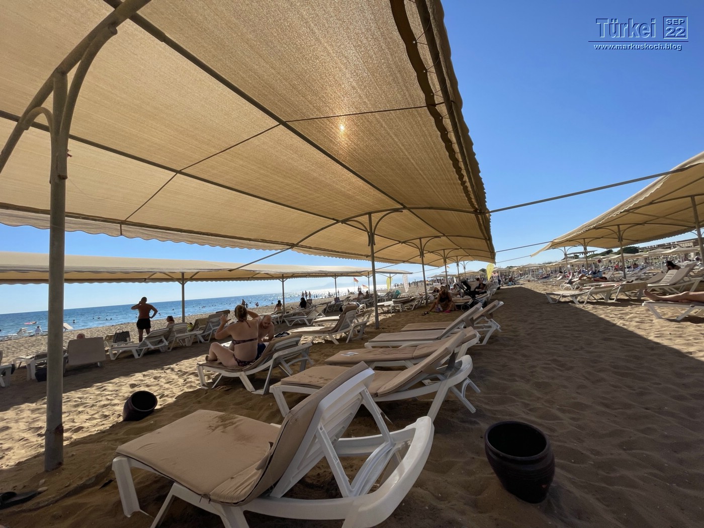 Nach dem leckeren Frühstück schauten wir das Hotel nochmals an. Wir erfuhren, dass wir das Nachbarhotel (weil gleiche Kette) auch nutzen durften. Das Onyx White ist ein Familienhotel, der Strandabschnitt ist wesentlich schöner, da nur eine dieser Absperrungen 200 m weg vom Strand zu sehen war.