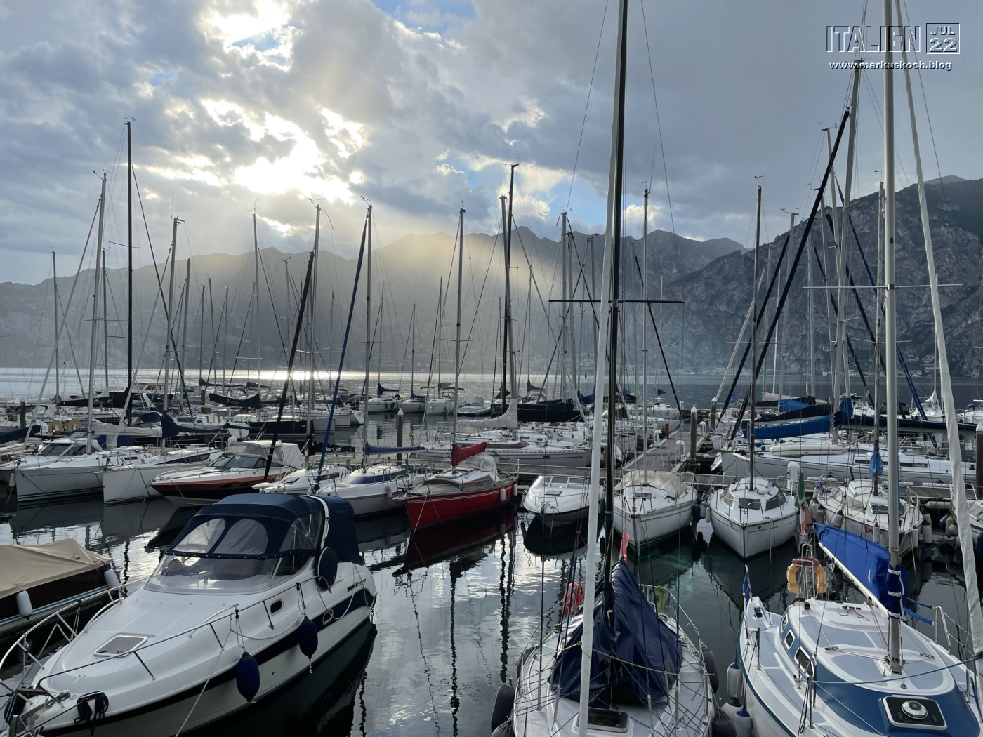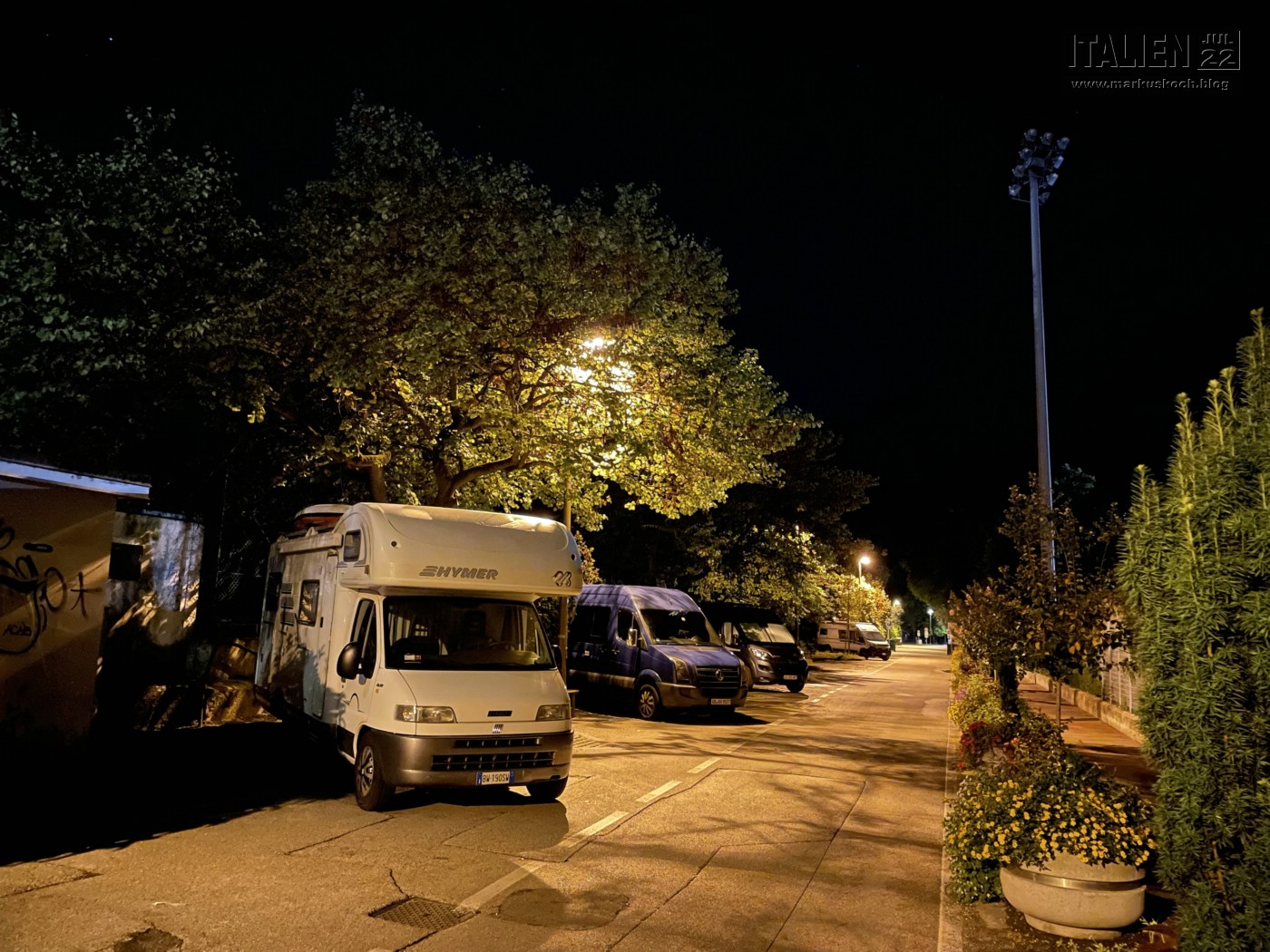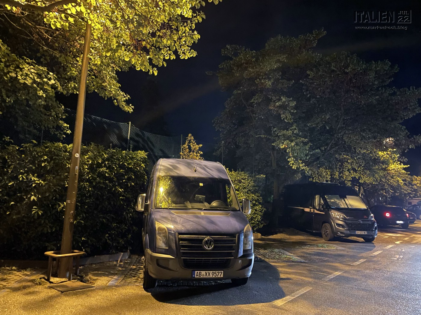 Nach sehr starken Regenfällen auf dem Weg vor und in Österreich war es dann am Gardasee wunderschönes Wetter. Ich kam Abends um 21 Uhr in Riva del Garda an und erwischte einen guten Parkplatz, auf dem es geduldet war mit dem Camper über Nacht stehen zu bleiben.