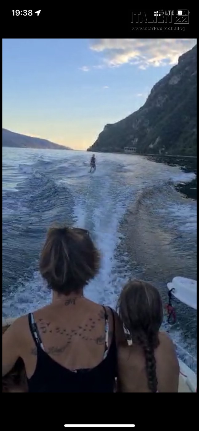 Am späten Nachmittag traf ich Markus mit Familie vom letzten Jahr, der dort ja seine Zweitresidenz & Boot hat. Er lud mich dann ein, wieder ne Runde mit im Boot zu fahren und sogar zu Wakeboarden. Erstaunlicherweise hat dies auf Anhieb mit Wasserstart super funktioniert ohne einmal auf die Nase zu fallen.