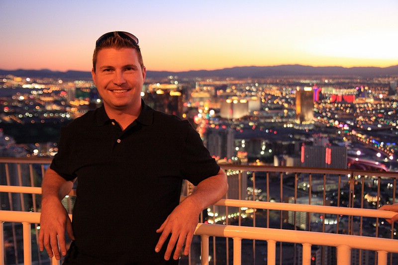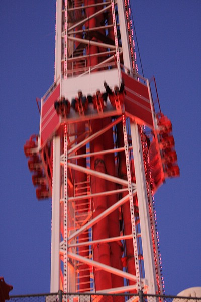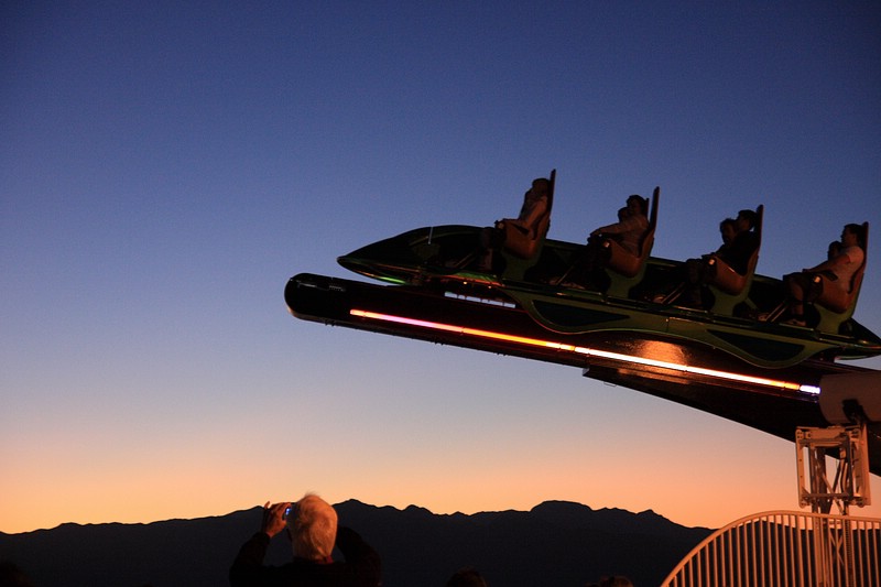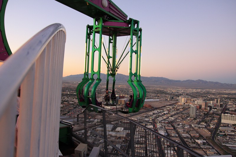 Nach der Mittagspause sind wir mit dem Auto zum Stratosphere Tower gefahren. Oben angekommen konnten wir den Sonnenuntergang über Las Vegas inkl. Vollmondblick genießen. Tommy und ich haben uns für zwei Fahrgeschäfte dort oben entschieden. Das eine war wie am Volksfest eher unspäktakulär, auch wenn es fast den Magen umgedreht hätte. Es war der Big Shot, der in mitten auf Spitze des über 300m hohen Towers uns nach oben und dann noch schneller gen Erdboden katapultiert hat. Noch besser war dann aber das Insanity. MIt dem Teil wurde man frei schwebend vom Tower über den Erdboden befördert. Dieser Ride drehte sich dann auch noch immer schneller, was einem dann endgültig den Magen umdrehte – einfach gigantisch und unbeschreiblich.