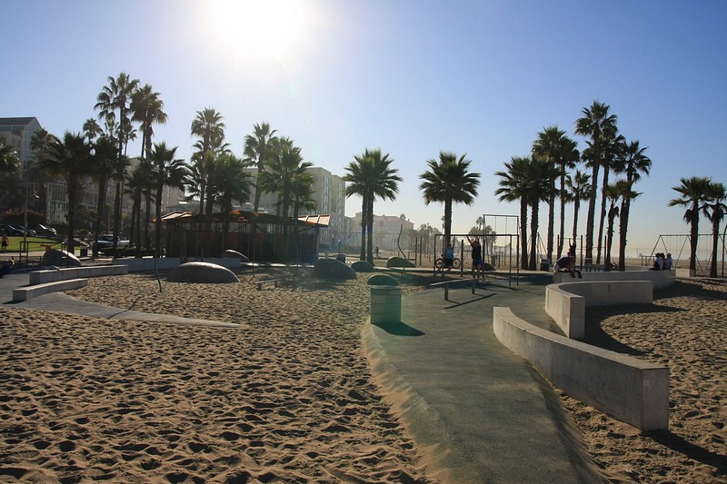 Mit dem Auto fuhren wir noch an diesen wahnsinnig breiten, sauberen, feinsandigen Venice Beach bei gefühlten 35°C Sonne pur – waren es sicher auch – entlang bis zum Ende, wo u.a. der Muscle Beach ist. Dort stählten so manche Muskelmaschinen ihre Mukkis. Wir natürlich auch LOL *G*