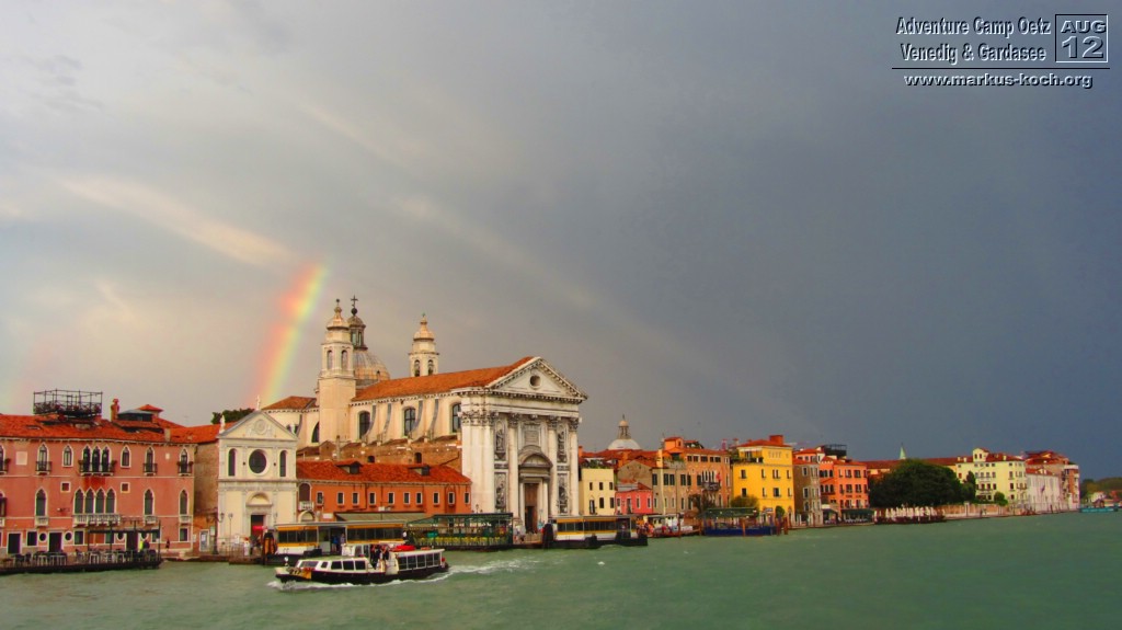 Nach dem Schock konnten wir um 18 Uhr unser Auto abstellen und mit einer Personenfähre von Fusina Terminal nach Venedig überfahren. Geregnet hat es dann gott sei Dank nicht mehr und wir wurden mit einem wunderschönen Regenbogen begrüßt. Quer durch Venedig zu Fuß ging es dann zu unserem Hotel Graspodeua an der Rialtobrücke. Quasie 10 m waren es vom Hotel zur Brücke. Idealer Ausgangspunkt. Aber leider war das Hotel „hinten“ drin und umgeben von anderen Häusern. Demenstprechend wenig war es auch gelüftet, aber gut, waren ja nur 2 Nächte da.