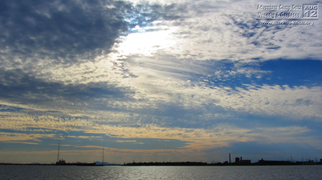 In Venedig angekommen wollten wir zu einem schon im voraus gebuchten 24h bewachten Parkplatz. Aber wir mussten erst eine fast 30-minütige Pause machen, da ein Sturm mit Gewitter 1 km vorm Ziel umhergefegt ist. Wir dachten, dass Schilder oder Bäume gleich das Auto durchlöchern würden, oder wir auf dem Gewitter-Regenwasser wegschwimmen könnten. Sowas habe ich selten gesehen!