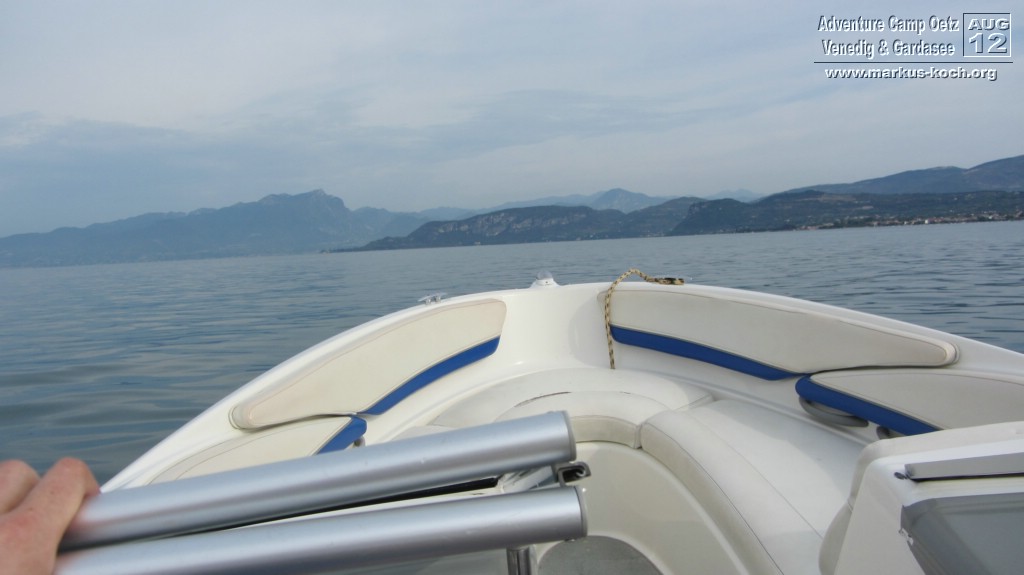 Für den Donnerstag habe ich uns bei Gardacharter direkt im Hafen vor der Tür in Lazise ein Motorboot gemietet – Eckdaten: Bayliner 205 Bowrider, Länge: 6,22 m, 220 PS, 300 €/Tag+100 € Spritkosten. Wunderbar endlich wieder mal mit einem Boot zu fahren.