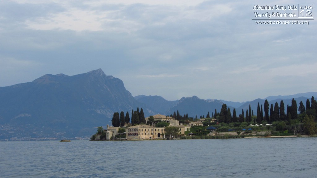 Wir sind von Lazise an der Küste entlang gefahren: Lacando San Vigilio (sind aber nicht an Land), Torri del Benaco, dann rüber zum Westufer (ganz schöne Wellen durch die Fallwinde aus dem Norden!!!): Toscolano Maderno, Gardone Rivera, Salo bis dann zur Insel „Isola del Garda“ mit Blick auf die wunderschöne Villa. Dort haben wir für eine Stunde geankert und es kam auch ab und zu die Sonne durch. Lecker haben wir unsere eingekaufte italienische Kost, die Sonne und die Ruhe genossen. Herrlich! Leider kamen etwas dunkle Wolken und wir sind lieber wieder auf die Ostseite zurück gefahren. Bei zu viel Wind aus Norden, sperrt das Amt öfters den See zum überqueren!