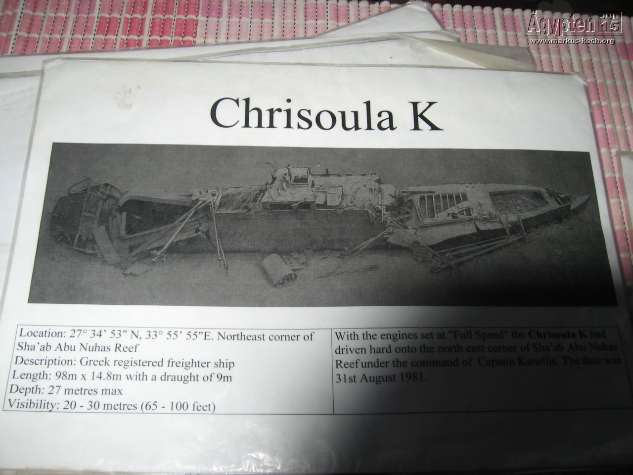 Die Orca Tauchbasis unter Führung des Österreichers Wolfgang ist Tipp-Top! Alles gepflegt, sauber, gut organisiert, klasse Tauchlehrer/Guides. Wir haben uns sehr wohl gefühlt und absolvierten eine Weiterbildung zum AOWD. Tauchlehrer Mahmoud war super drauf und hat uns alles verständlich erklärt. Da wir noch Zeit für weitere Zertifizierungen hatten, machte Michael noch seinen Nitrox-Schein und wir beide bei Mustafa einen weiteren Speciality Kurs im Tieftauchen (max. 40m). Insgesamt konnten wir in dieser Woche 12 mal von Board ins blaue Nass abtauchen. Besonders interessant waren auch 2 Tauchgänge zum Wrack „Chrisoula K“, welches wir auch im Innenraum betauchten. Es hat riesen Spaß gemacht und lernten eine Menge an Erfahrung dazu und trafen tolle Mittaucher.