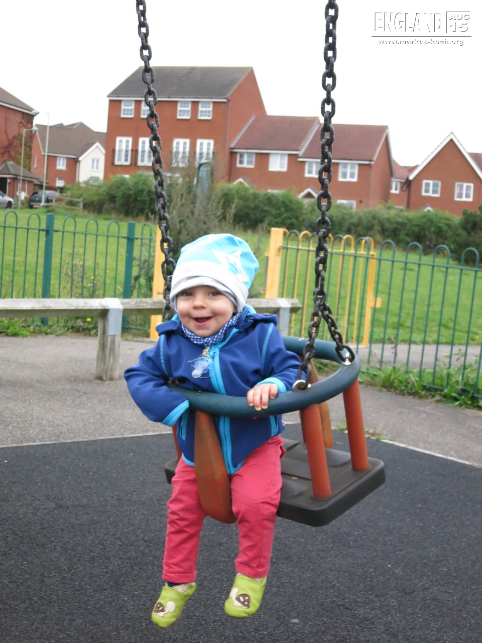 Am Sonntag war nicht viel geplant, ein ausgedehntes Frühstück daheim, dann ein kurzer Besuch bei Phils Mum, die nicht weit weg wohnt und am Nachmittag ein Spaziergang ins Zentrum von Haverhill. Auf dem Rückweg konnte sich unser Sohn auf einigen der vielen Spielpätze austoben. Er hatte sichtlich Spaß. Gerade jetzt, wo er anfängt die ersten Schritte ohne Festzuhalten zu gehen 🙂