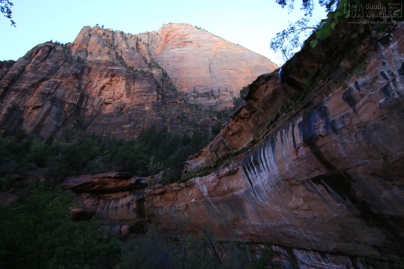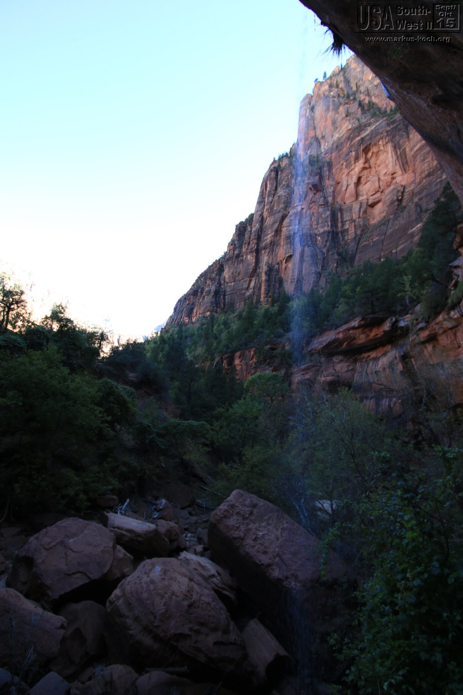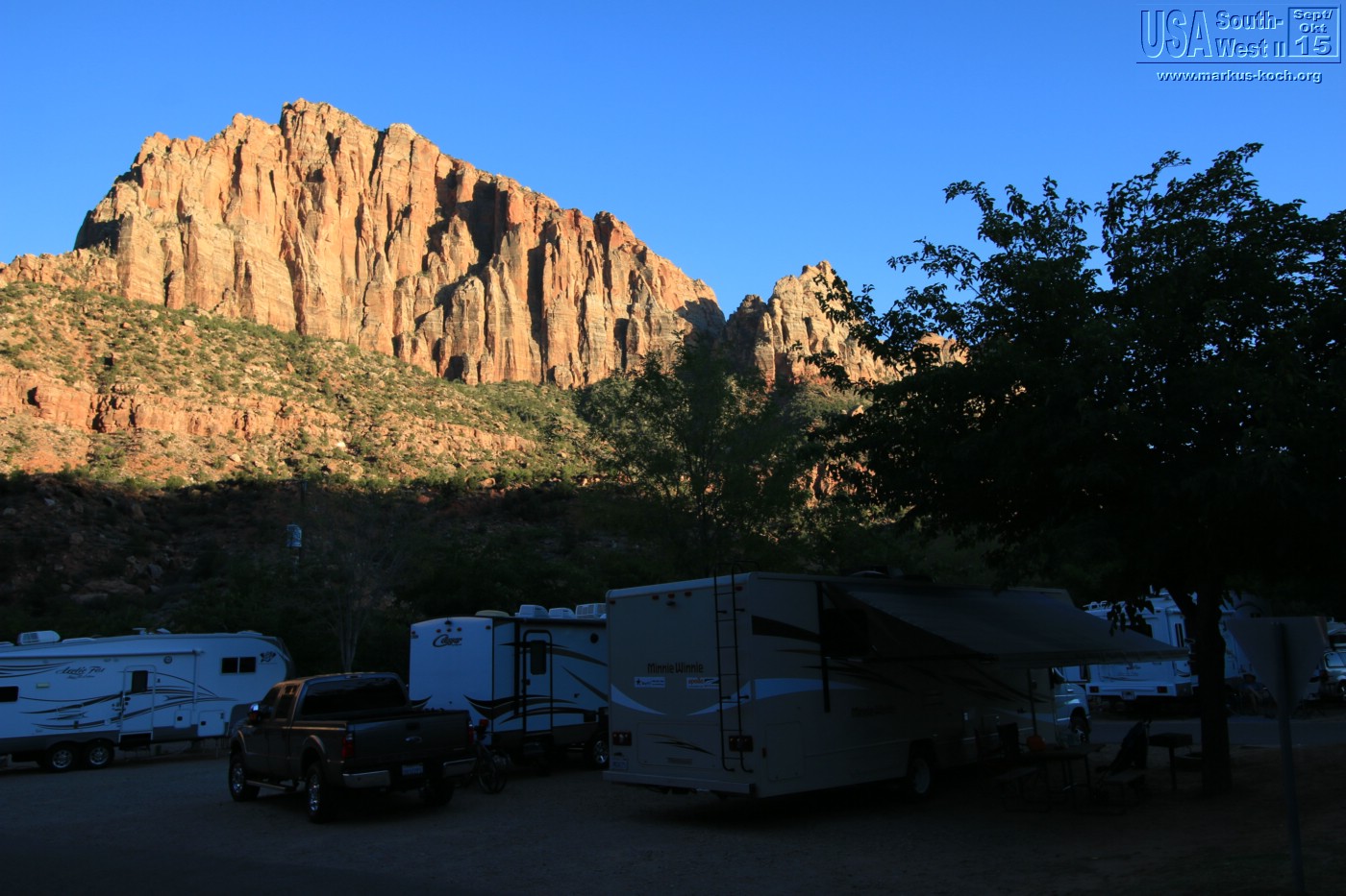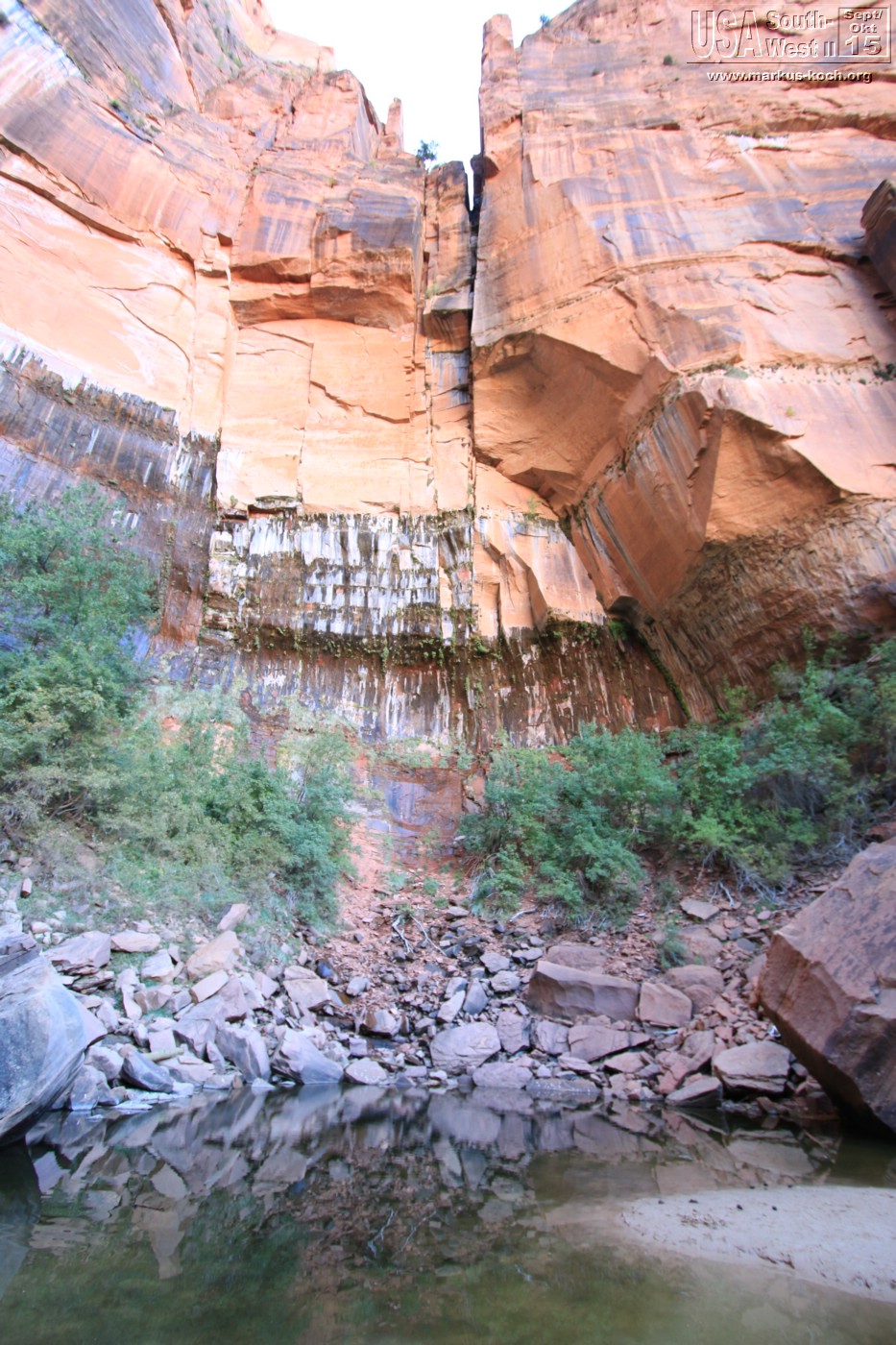 Weiter ging es über einen kurzen Halt in St. George (IN-OUT-BURGER, Walmart Babynahrung) in den ZION Nationalpark. Nach dem Anschließen des RVs an die Elektrizität + Wasserzufuhr machte ich mich nochmal kurz auf den Weg zu den Lower & Upper Emerald Pools. Auch hier war kaum Wasser vorhanden, sodass alles eher etwas lau aussah.