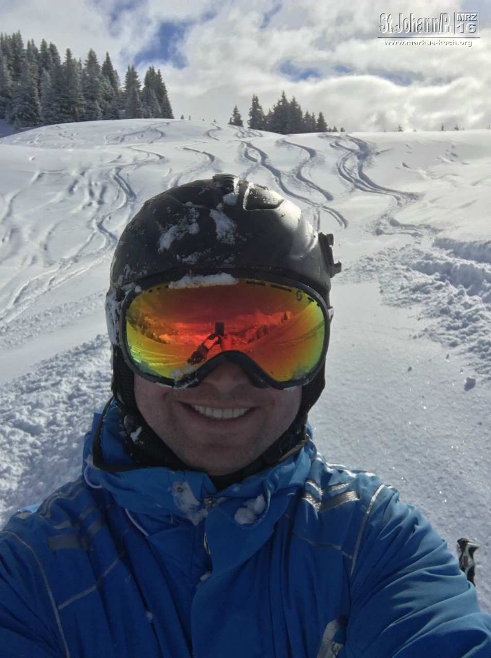 Nach leckerem Frühstück startete der Tag an unserem Hausberg im Alpendorf (5 min mit dem Skibus direkt vom Hotel). Am Gipfel angekommen erwartete uns ein toller Neuschnee. Mit 35 cm Powder fanden wir zufälliger Weise eine nicht präparierte Tiefschneepiste, wo es auch noch links und rechts, teileweise sogar im Wald, hinaus ging. Ganz toll dort, es machte tierisch Spaß!!!!