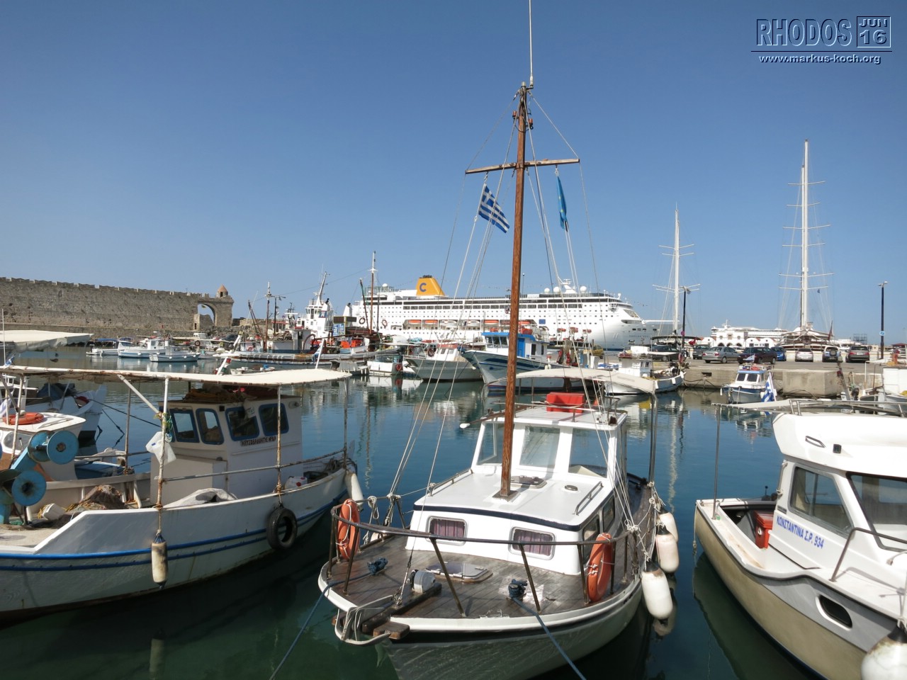 Rhodos-Stadt: Sie besteht aus einer modernen Neustadt und einer Altstadt, die vollständig von einer Stadtmauer umgeben ist. Über der Stadt finden sich auf dem Monte Smith die Reste einer antiken Akropolis – haben wir aber nicht besucht. Es gibt zwei Häfen. Am Eingang des antiken Mandraki-Hafens stand angeblich der Koloss von Rhodos.