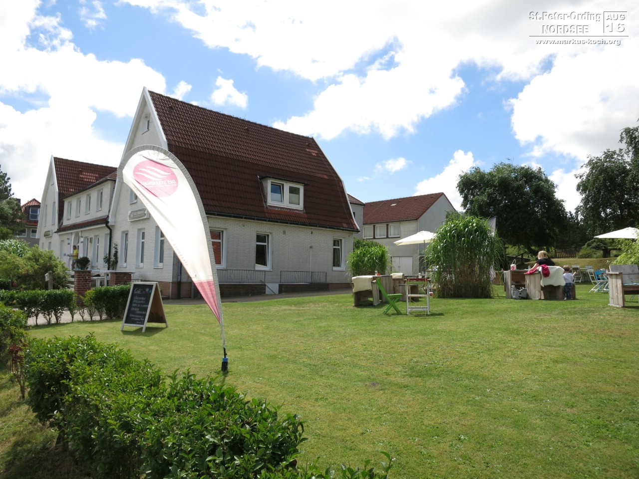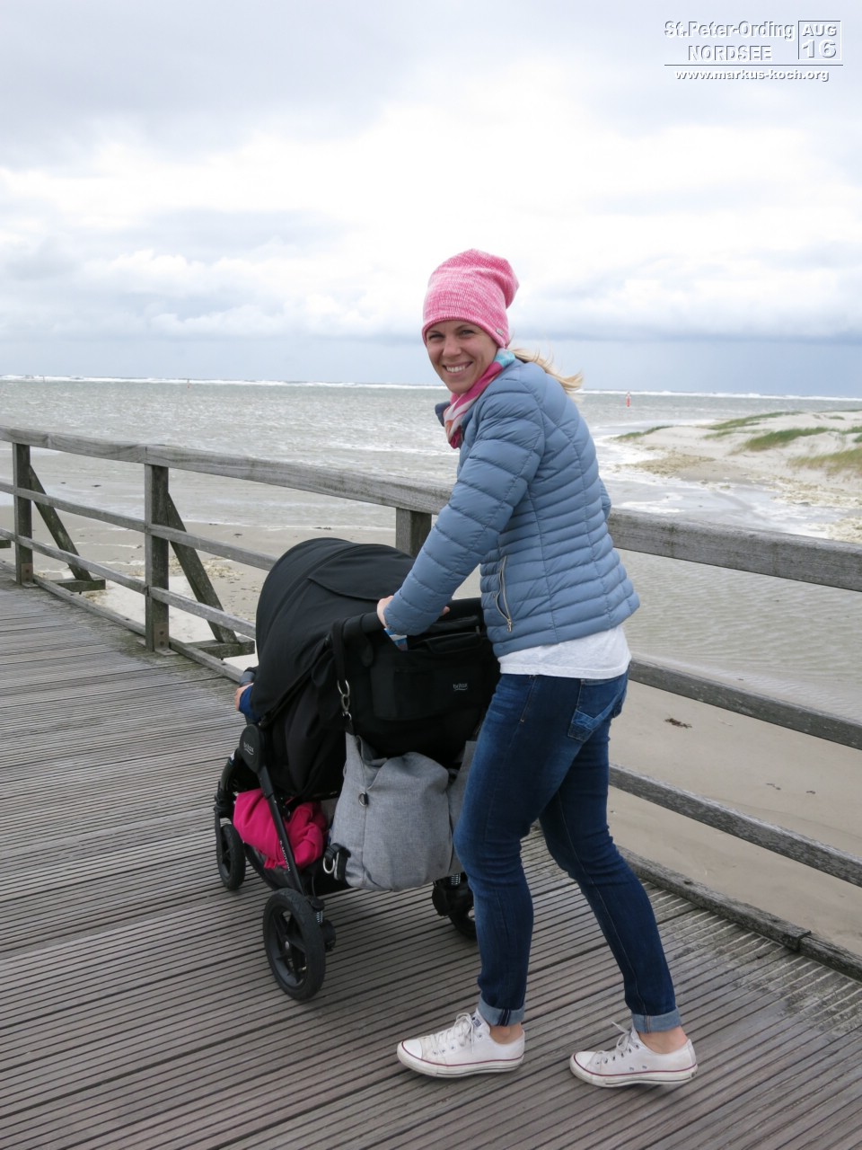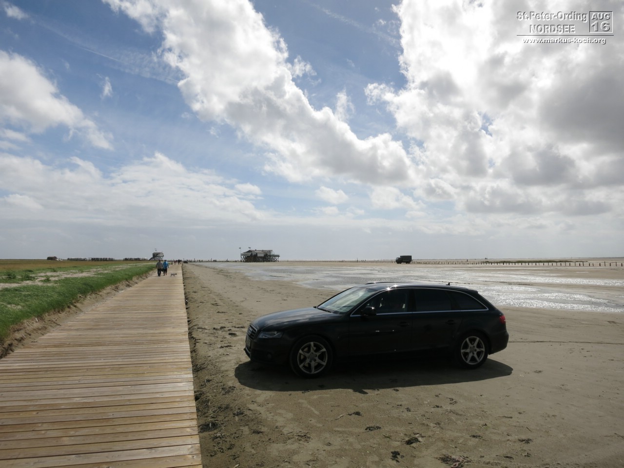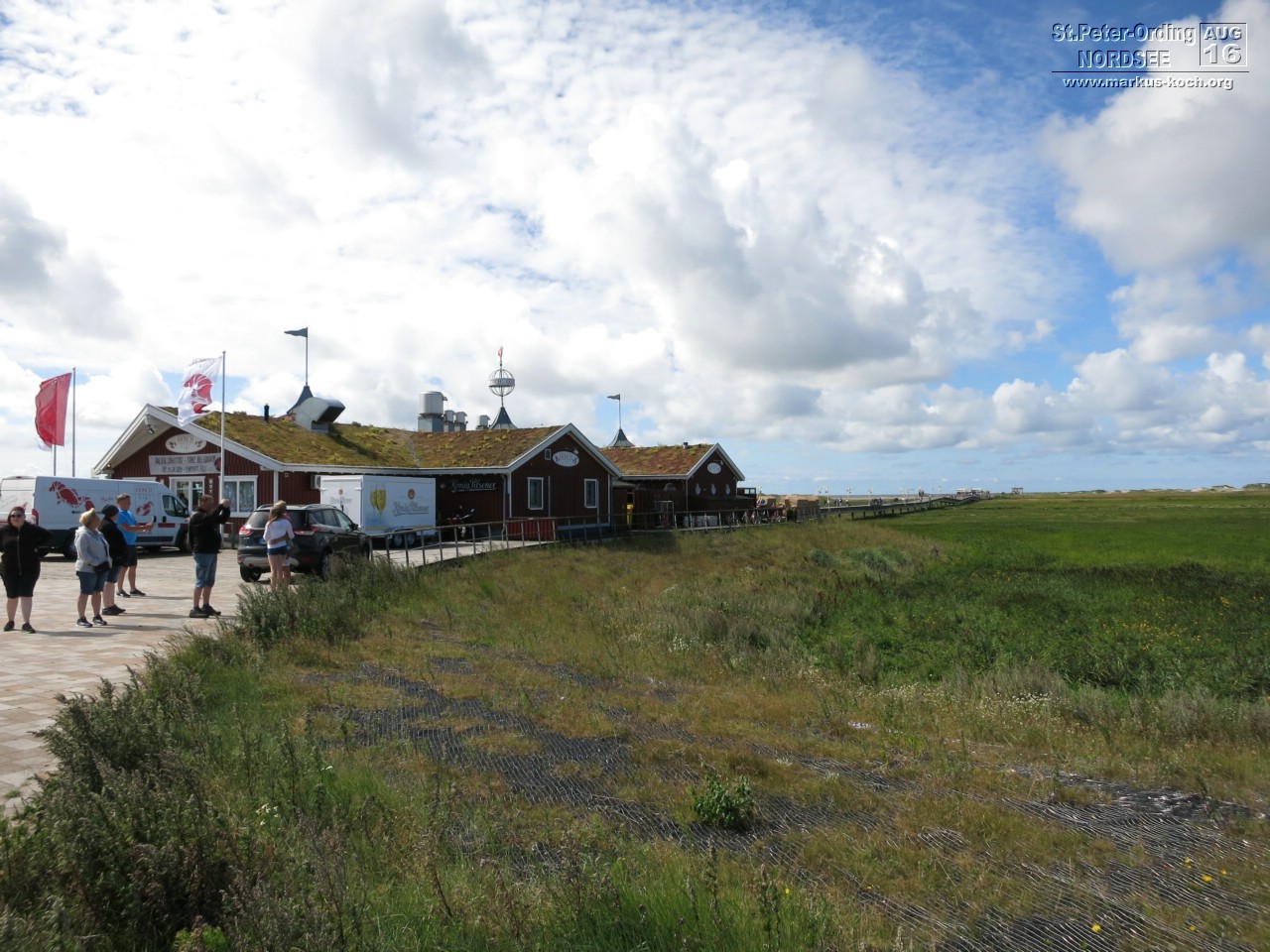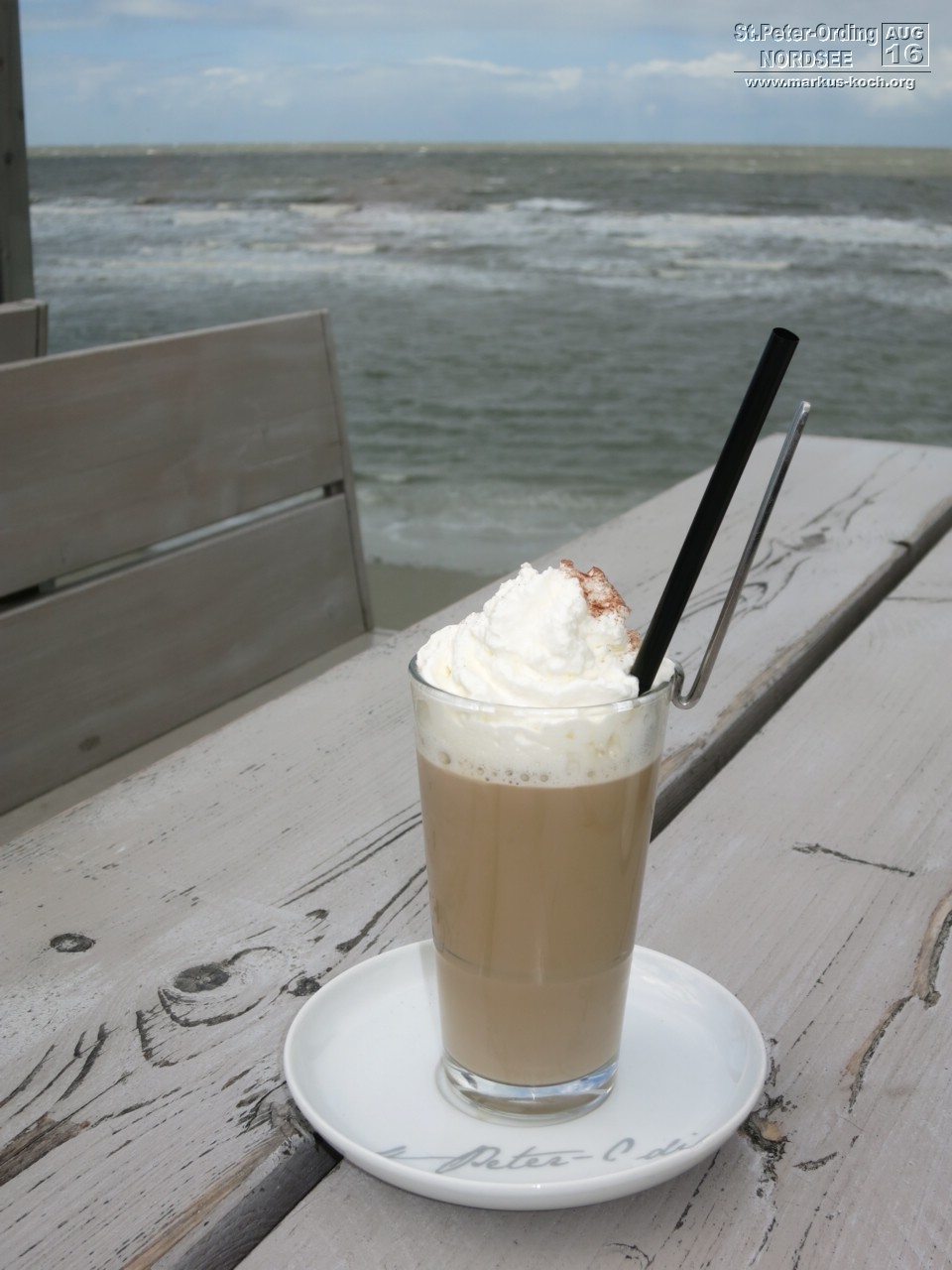 In Sankt Peter-Ording (SPO) angekommen konnten wir noch nicht in unsere Ferienwohnung, weswegen wir uns zu Kaffee in einem wunderschön angelegten Strandhaus entschlossen. Anschließend liefen wir auch gleich mal zum Strand von dort über einen Steg im Sand.