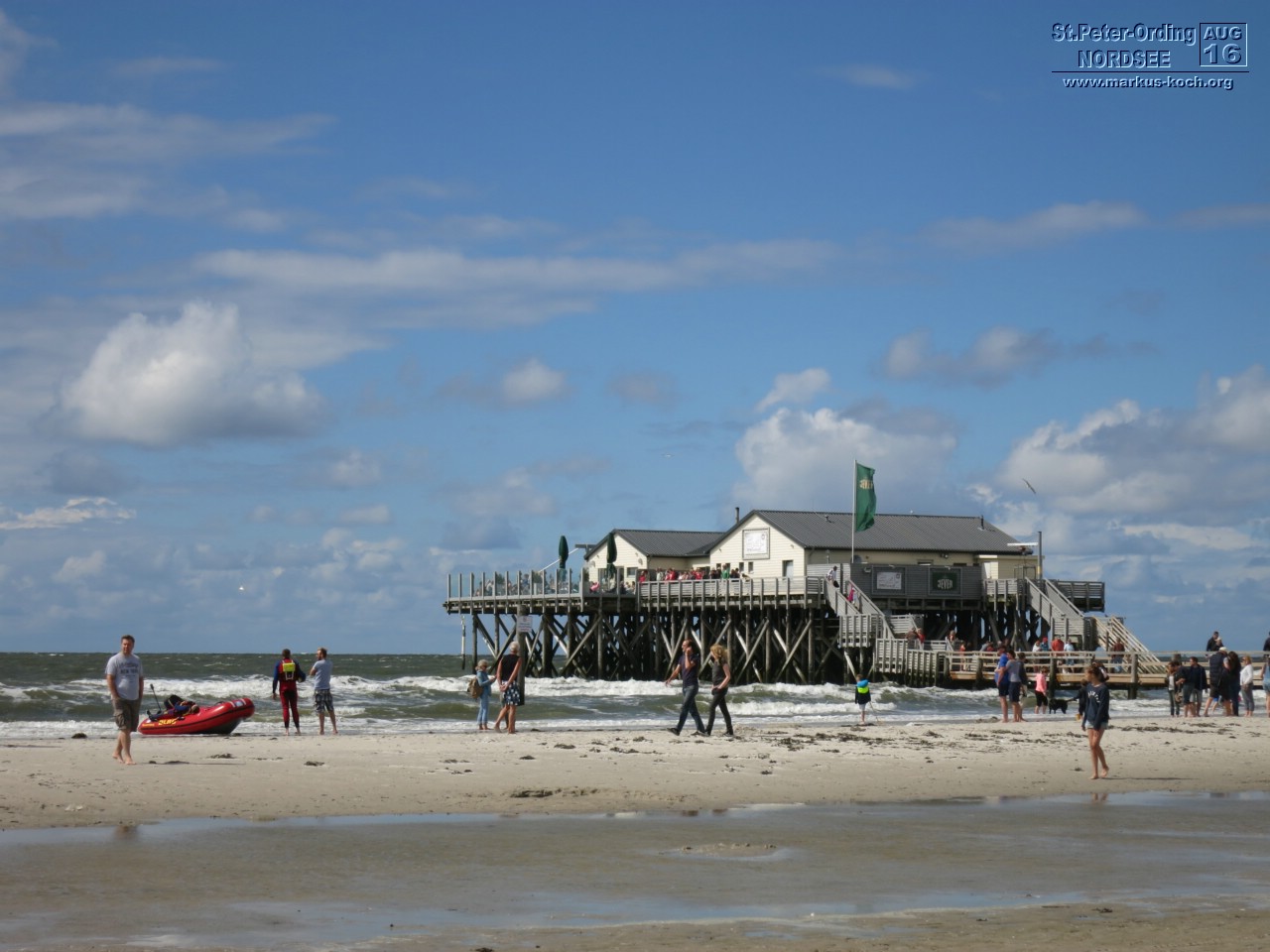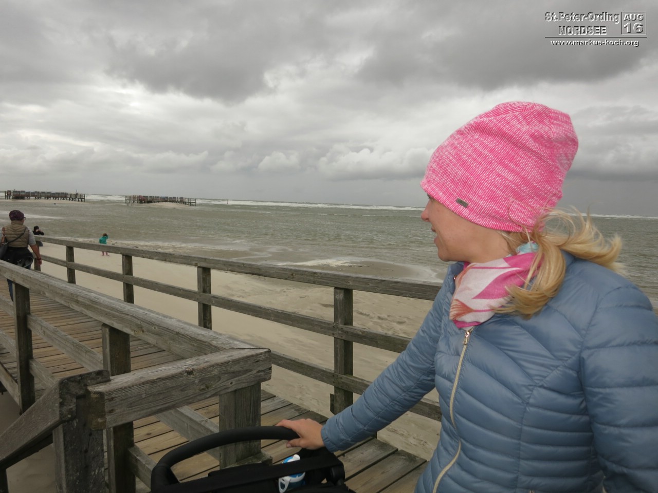 Als wir dann am Pfahlhaus waren, war die Flut doch schon sehr nahe, sodass wir entschlossen gleich wieder zu fahren. Das ganze Spektakel wollen wir uns nun vom Steg an der Strandpromenade ansehen.
