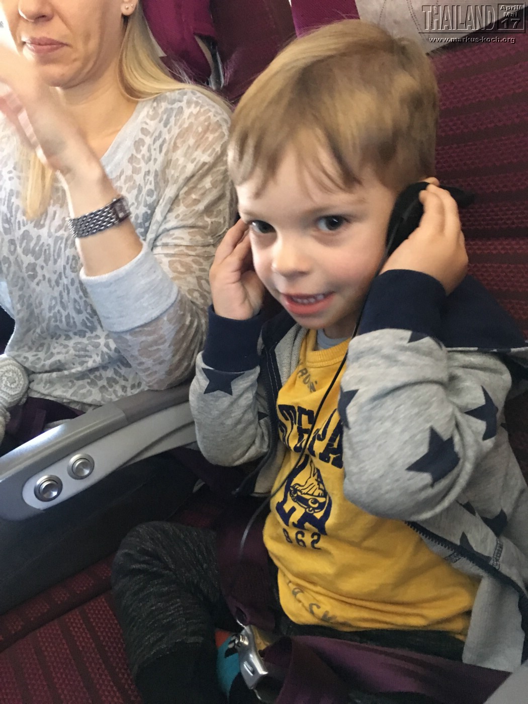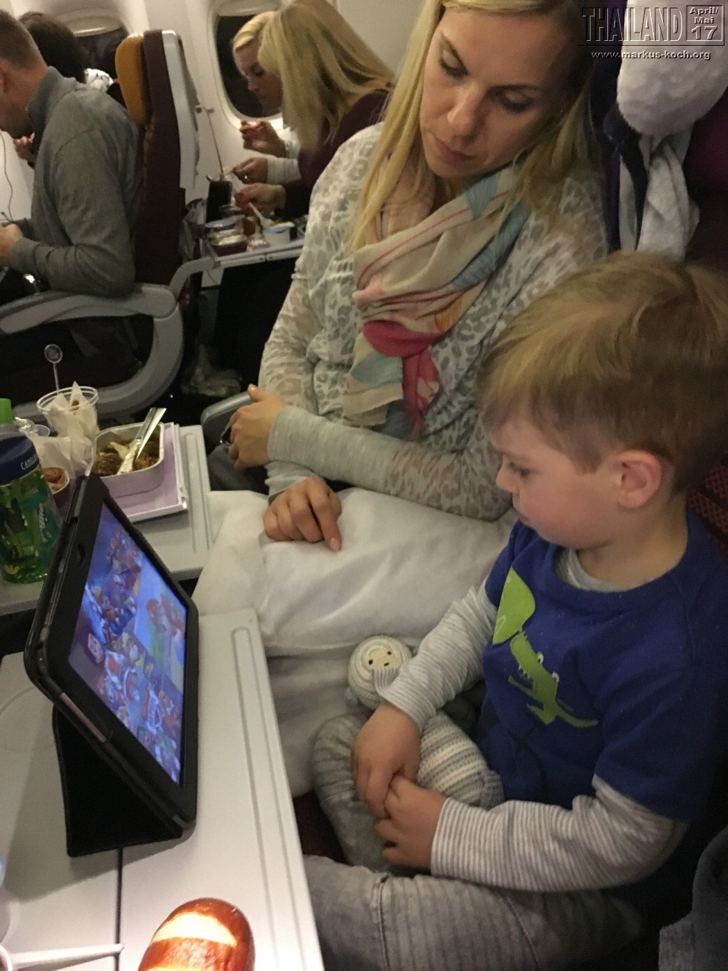 Der Flug war eigentlich sehr entspannt und die Zeit ging wunderbar schnell herum. Luca hat nach einmal brechen 🙁 auch viel geschlafen. Er hatte die ganze Zeit schon Husten und er lag etwas komisch auf seinem Sitz. Am gehusteten Schleim hat er sich dann scheinbar übergeben. Aber zum Glück nur dieses eine Mal und auf die Decke von Thai Airways.