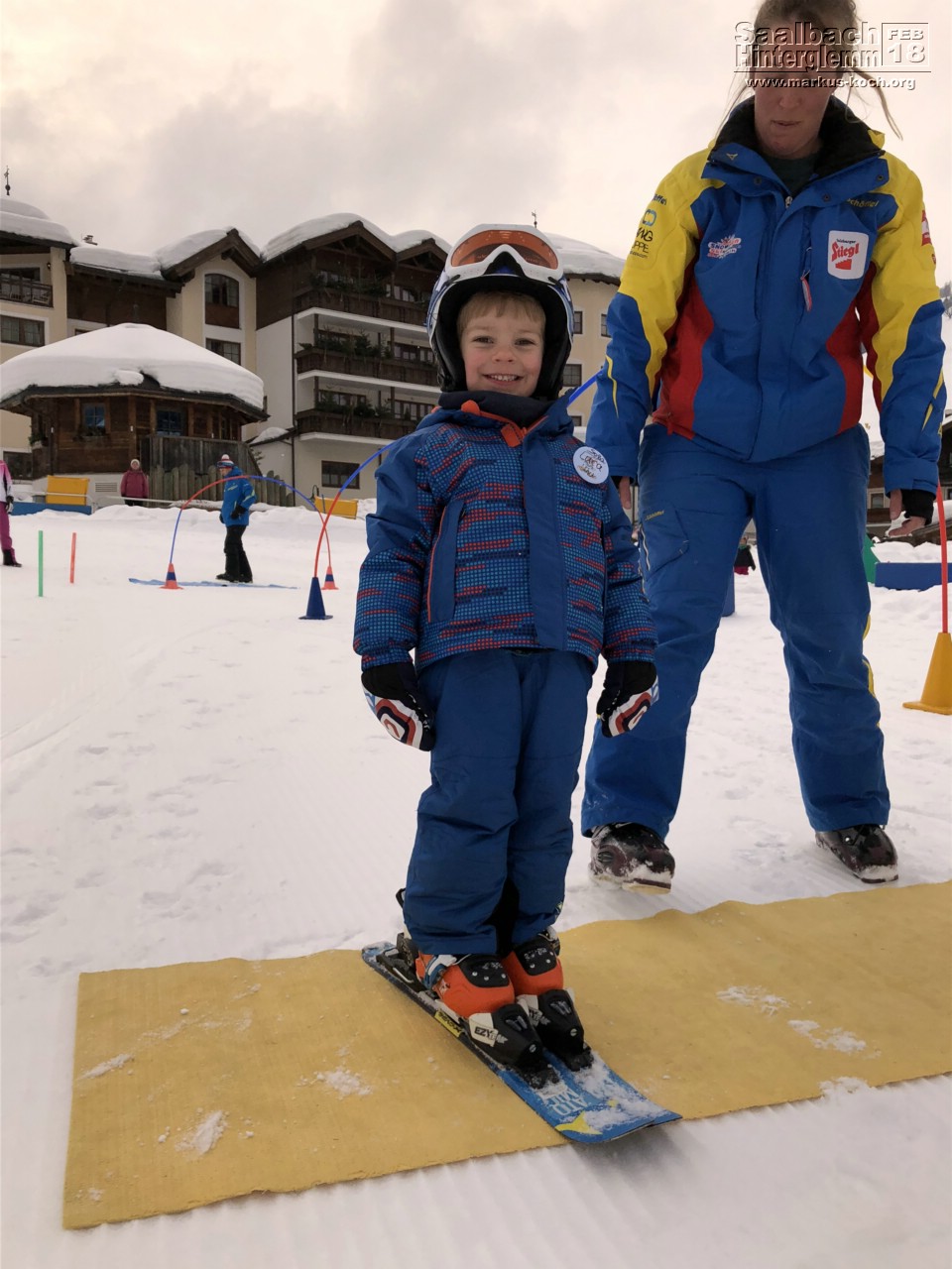 Wie ein großer Skifahrer startete Luca seinen ersten Skikurs mit richtigen Ski + Schuh und mehreren Kindern. Für 2 Stunden hat er die ersten bewussten „Skischritte“ gelernt. Es hat ihm – so sagte er – „Spaß gemacht!“ und er wollte am nächsten Tag nochmal.