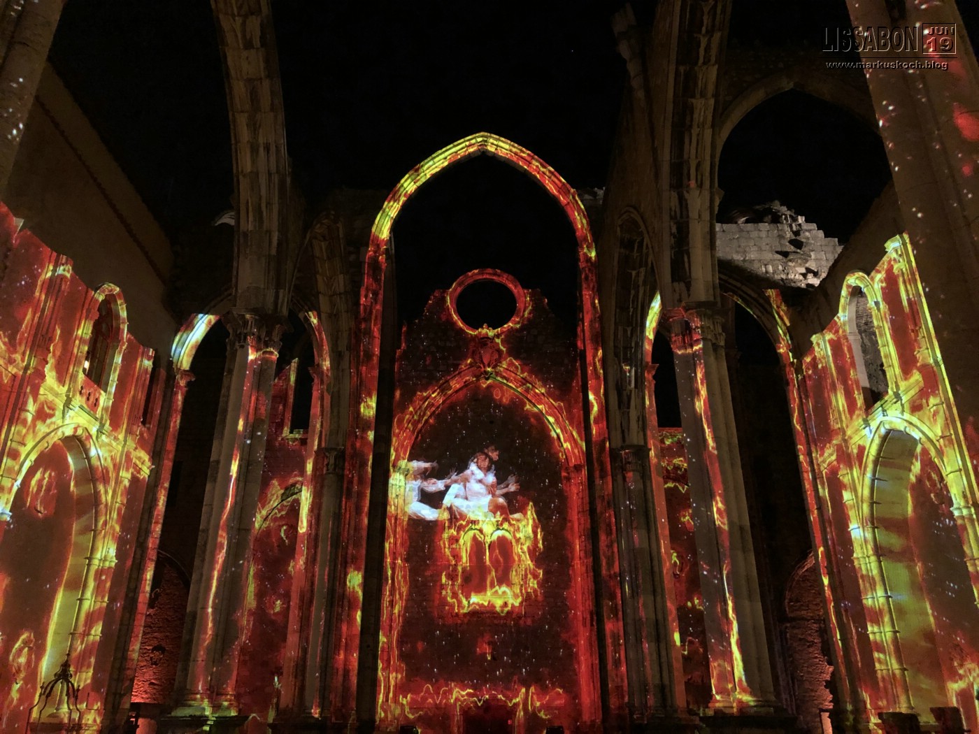 Abends bin ich nochmal alleine für ein paar Eindrücke Lissabons losmarschiert. Jedoch kam ich gar nicht so weit. Direkt am oberen Ausgang unserer Unterkunft lag die Kirche Igreja do Carmo, gleichzeitig kleines Archäologisches Museum. Der Kirche fehlt das Dach, durch das große Erdbeben am 1. November 1755 zerstört, steht sie nun als Mahnmal da. Und in dieser Kirche fand genau just in diesem Moment eine Projektionsshow statt – Lisbon under Stars. Kurzum besuchte ich diese 45 Minütige Vorführung im Dunklen. Die Geschichte der Kirche, bzw. teils Lissabons/Portugals wurde auf den Bildern erzählt. Beeindruckend!