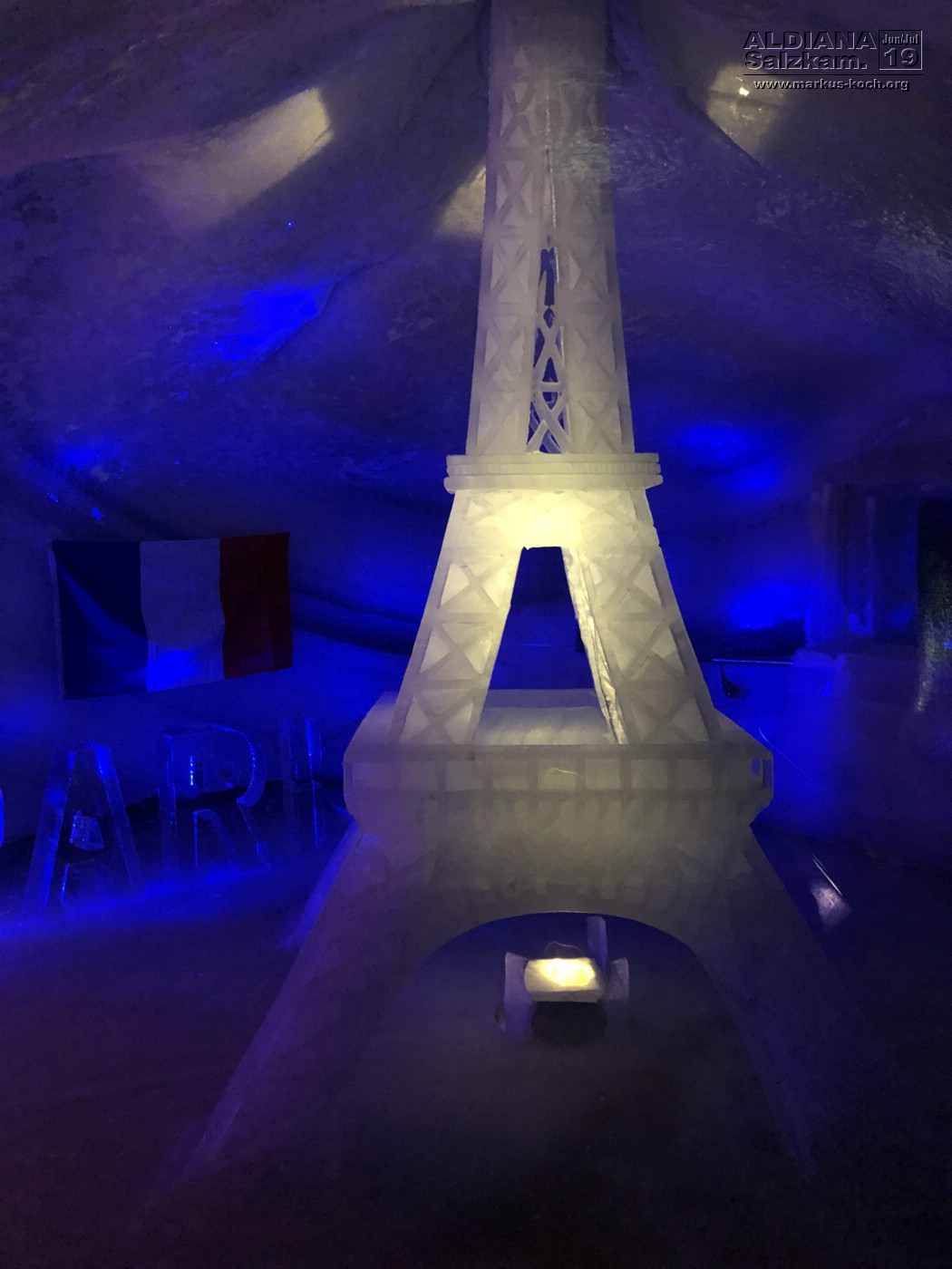 Dort oben war es herrlich luftig mit einem super Ausblick. Über eine Hängebrücke besichtigten wir unter dem Steinmassiv einen Eispalast mit der Ausstellung „Europa“ – aus Eis gefertigte Wahrzeichen, wie Berliner Mauer, Eifelturm oder Prater Riesenrad Wiens.