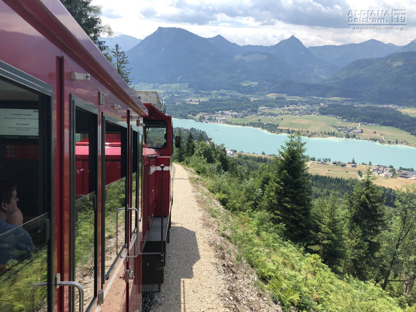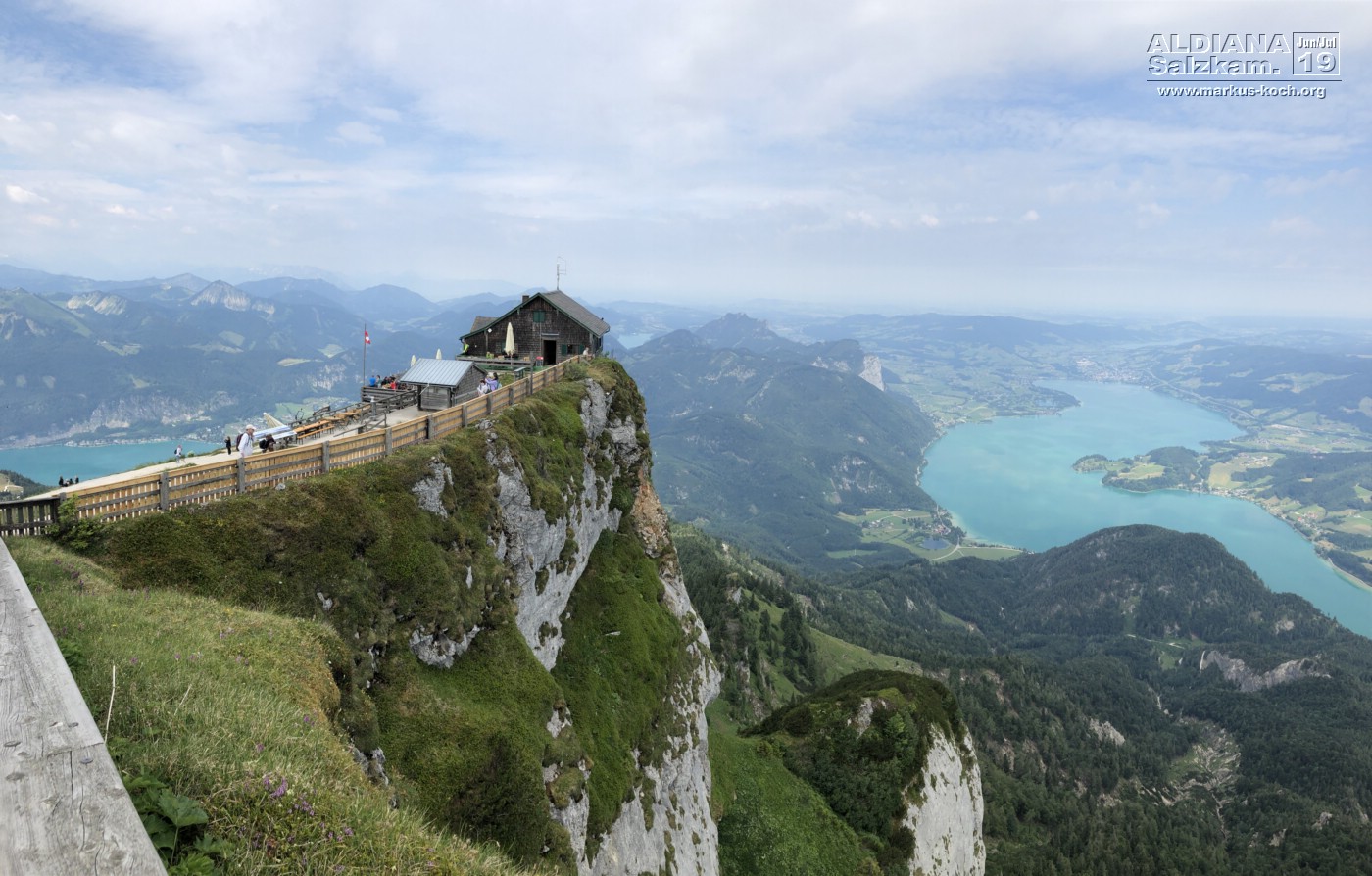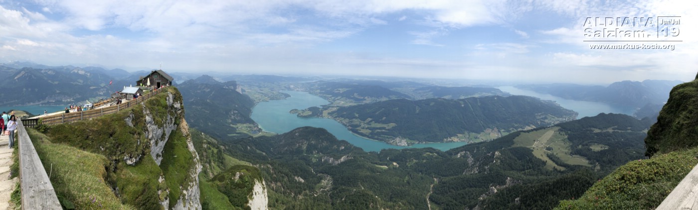 Nach der 30-minütigen Fahrt mit der von einer Dampflok betriebenen ruckelnden Zahnradbahn konnten wir dort oben eine herrliche Aussicht auf viele Seen (Wolfgangsee, Mondsee, Attersee und noch zwei mir nicht bekannte) erhaschen.