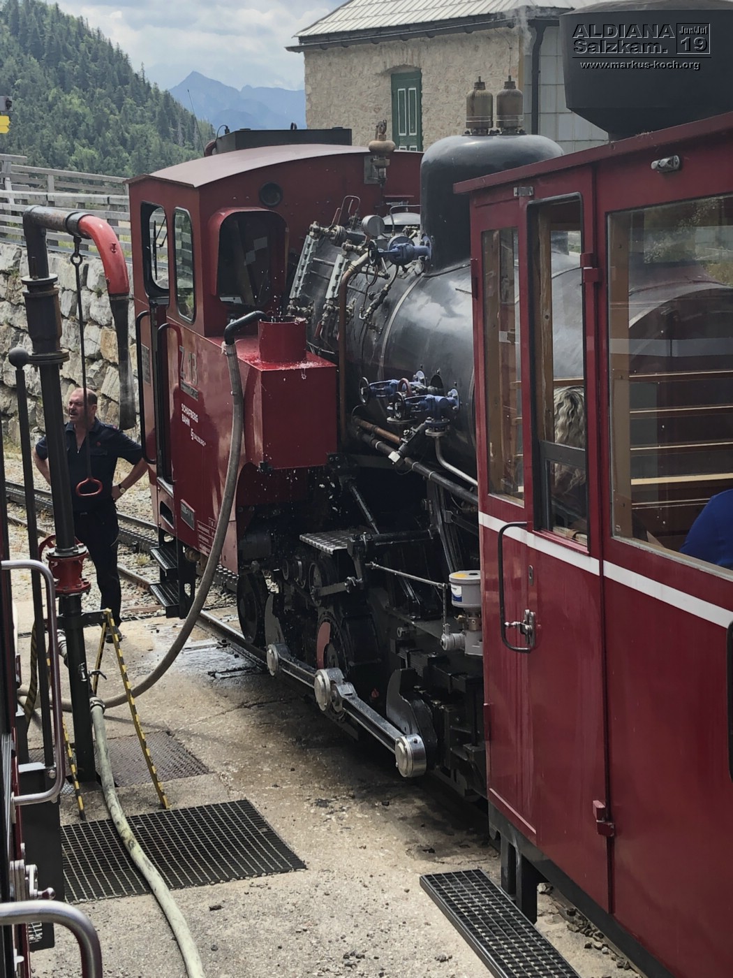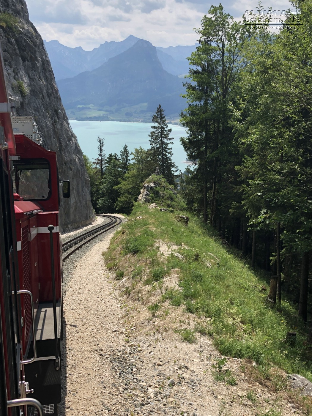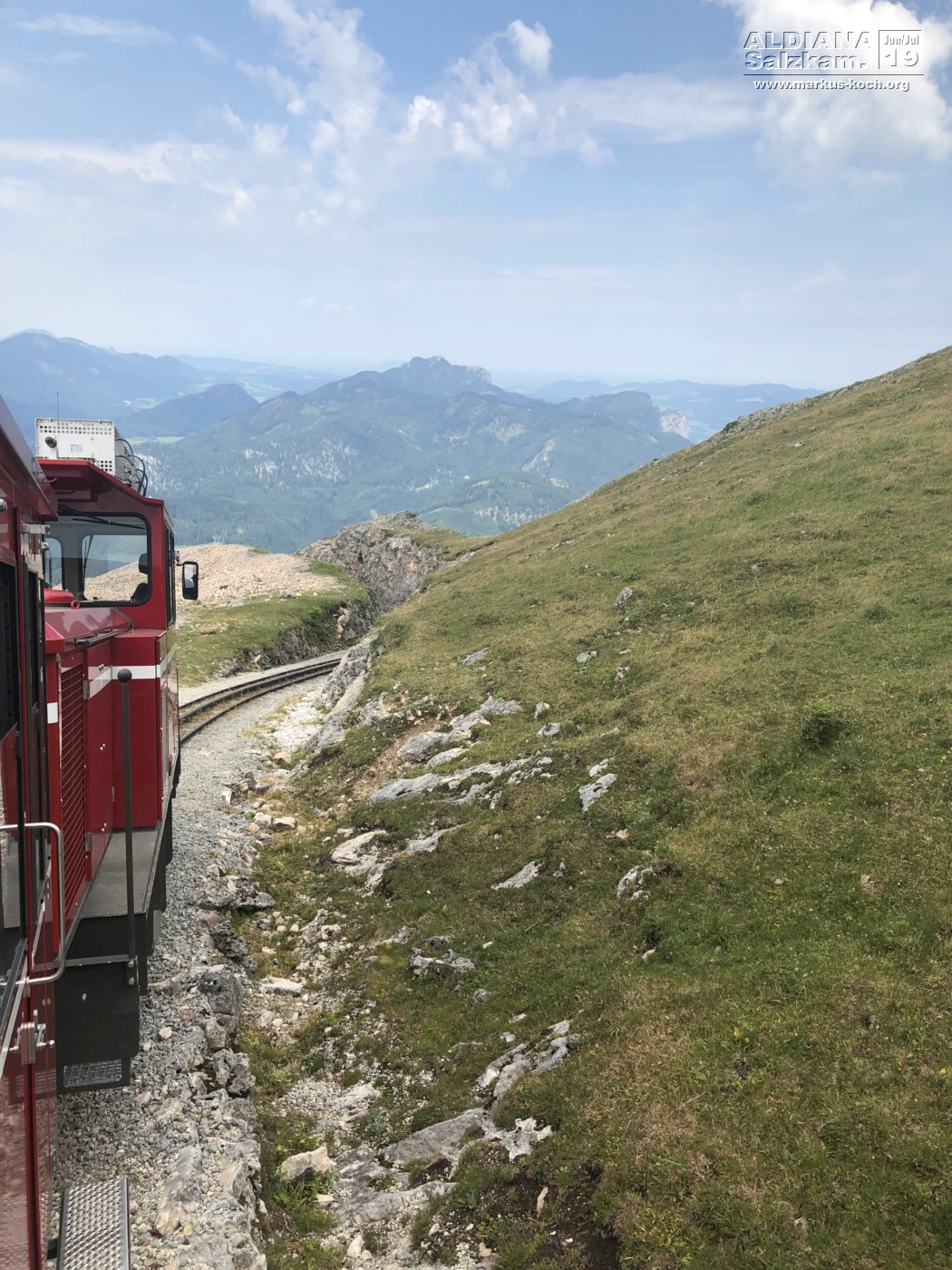 Nach der 30-minütigen Fahrt mit der von einer Dampflok betriebenen ruckelnden Zahnradbahn konnten wir dort oben eine herrliche Aussicht auf viele Seen (Wolfgangsee, Mondsee, Attersee und noch zwei mir nicht bekannte) erhaschen.