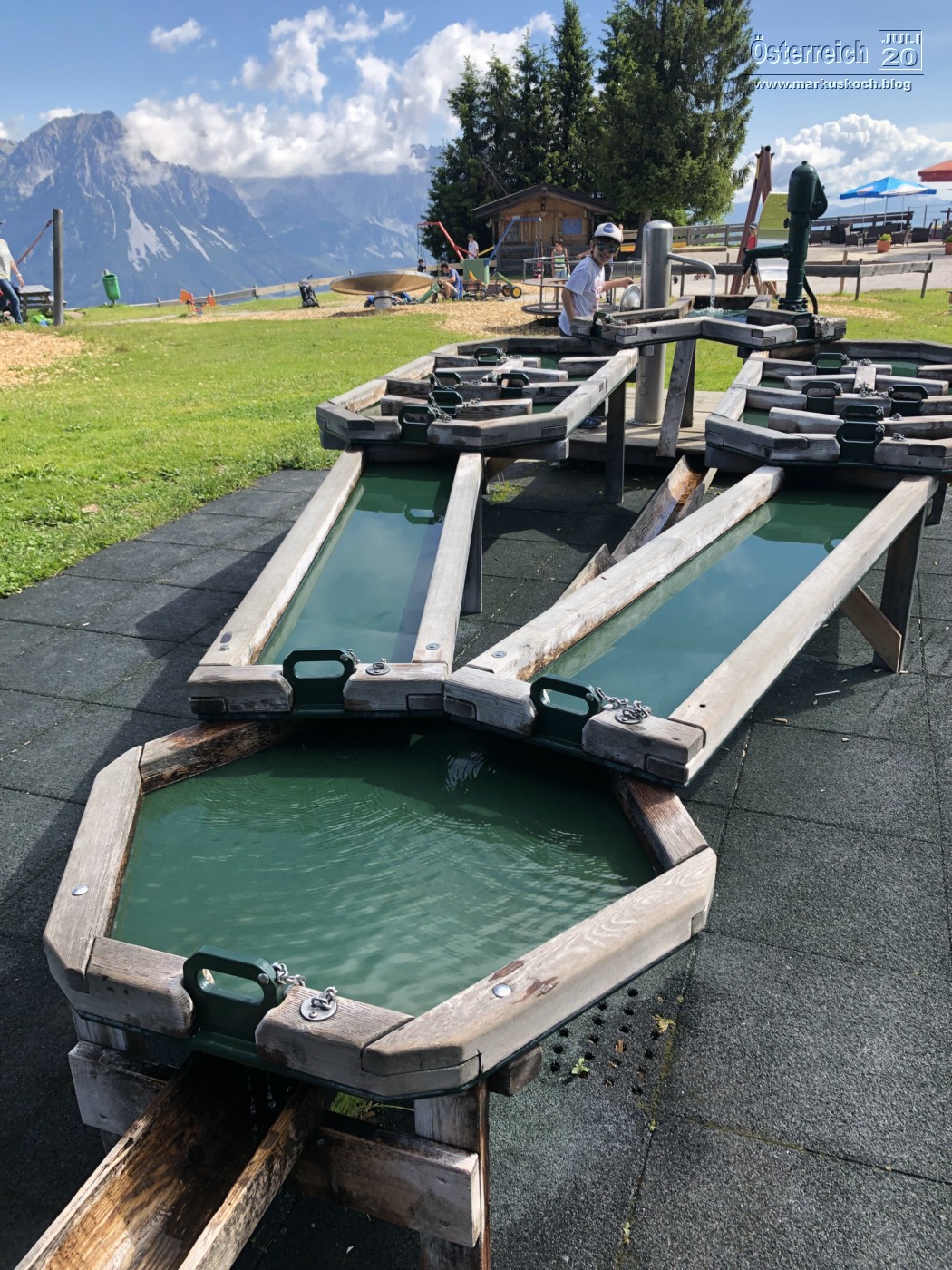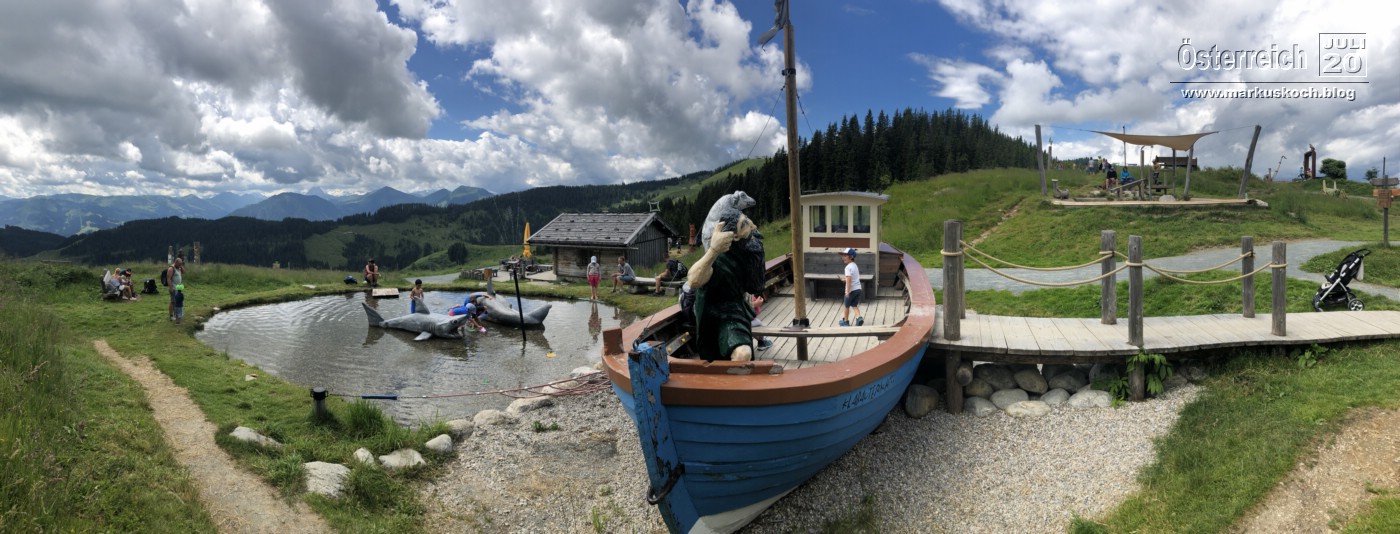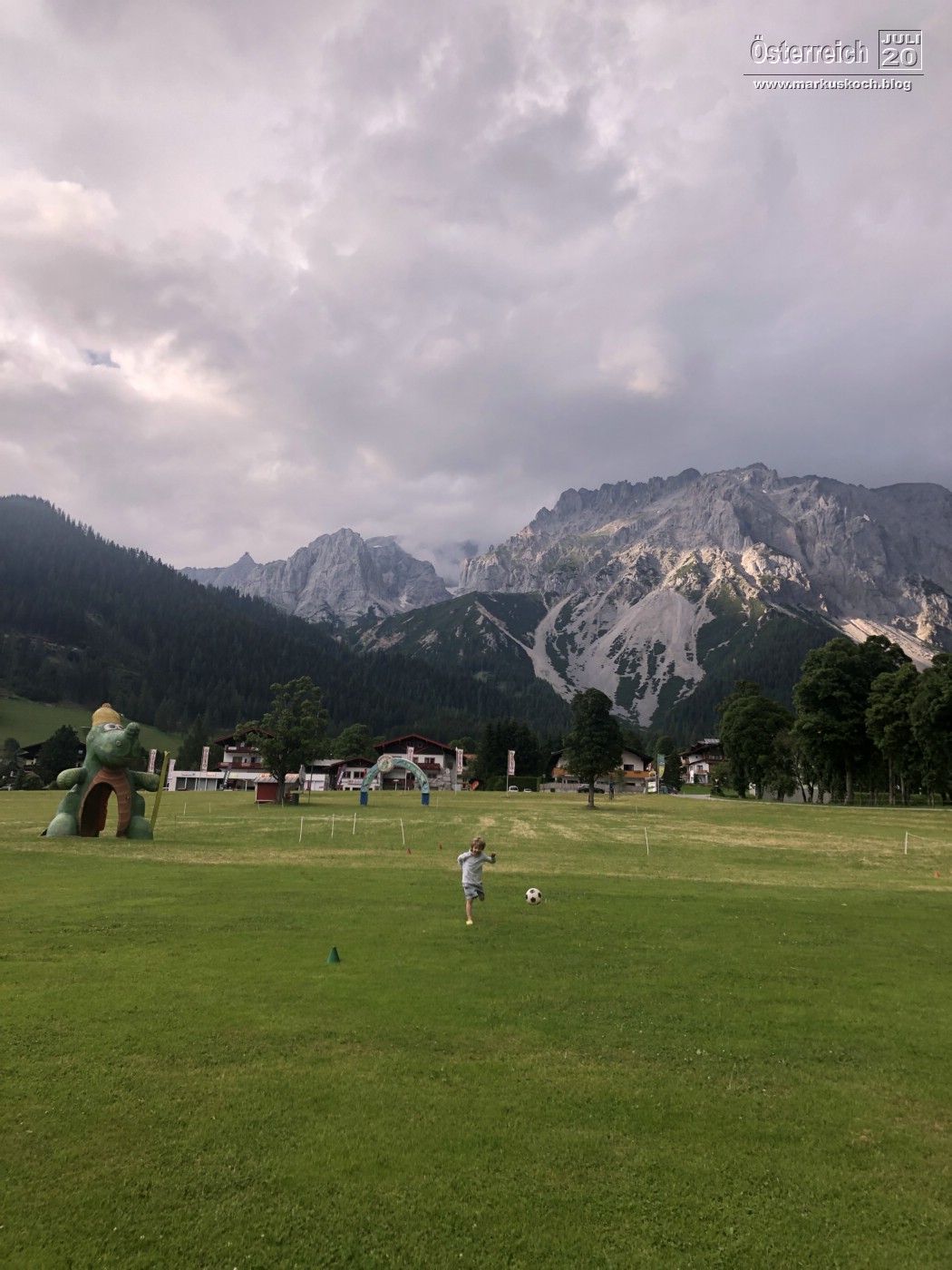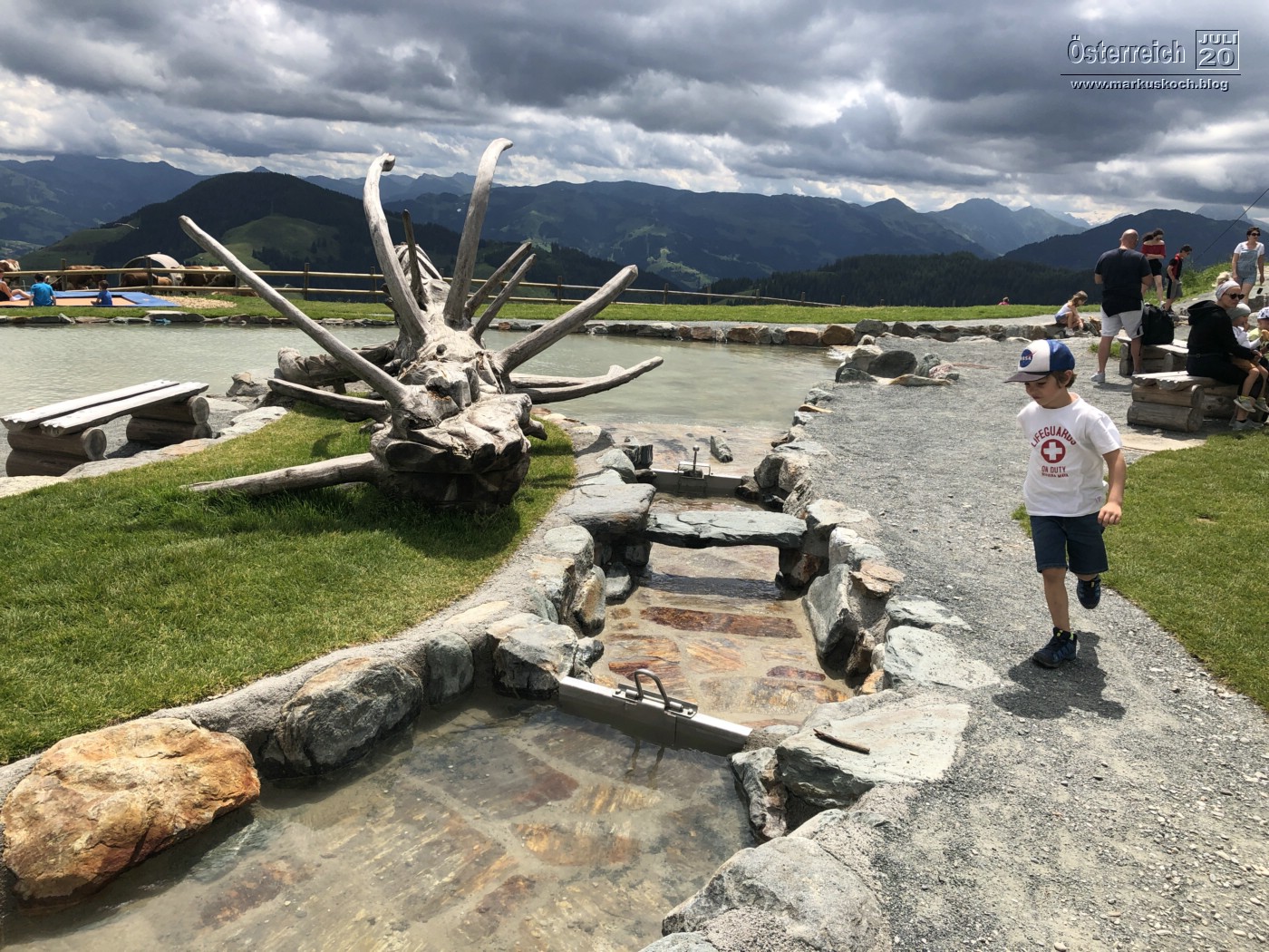 Zunächst spielten wir mit Blick auf den Wilden Kaiser an der Erlebniswelt Scheffau, dann wanderten wir zur Zauberwelt Ellmau (ca. 1 h) wo wir bis zum einsetzenden Regen die Zeit verbrachten. Mit dem Bus ging es dann zurück zum WoMo nach Scheffau und dann zurück zum Thiersee an den CG.