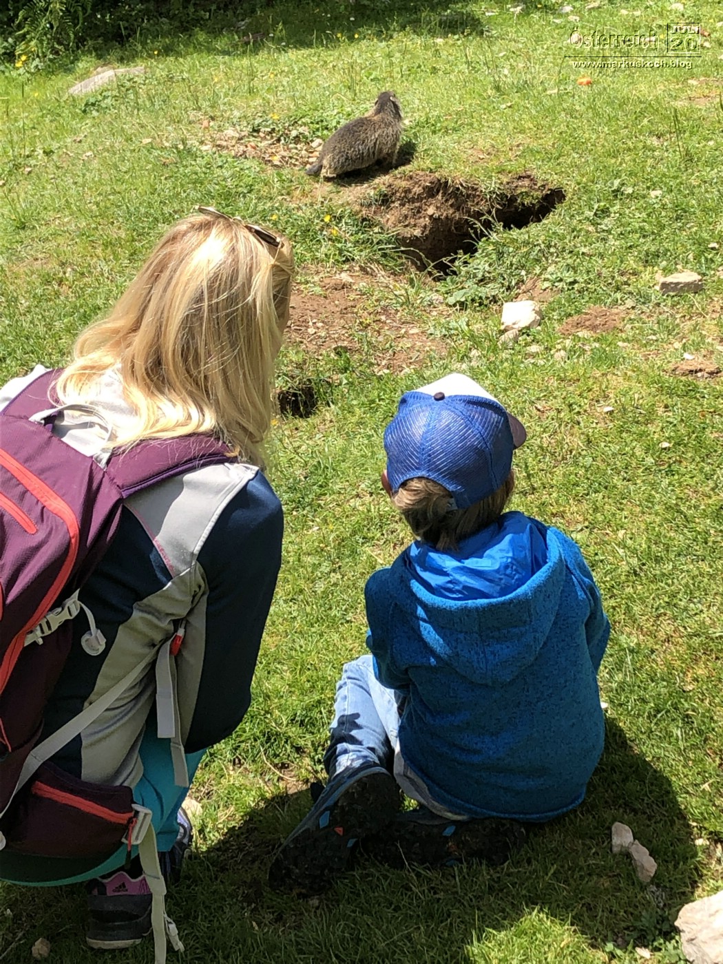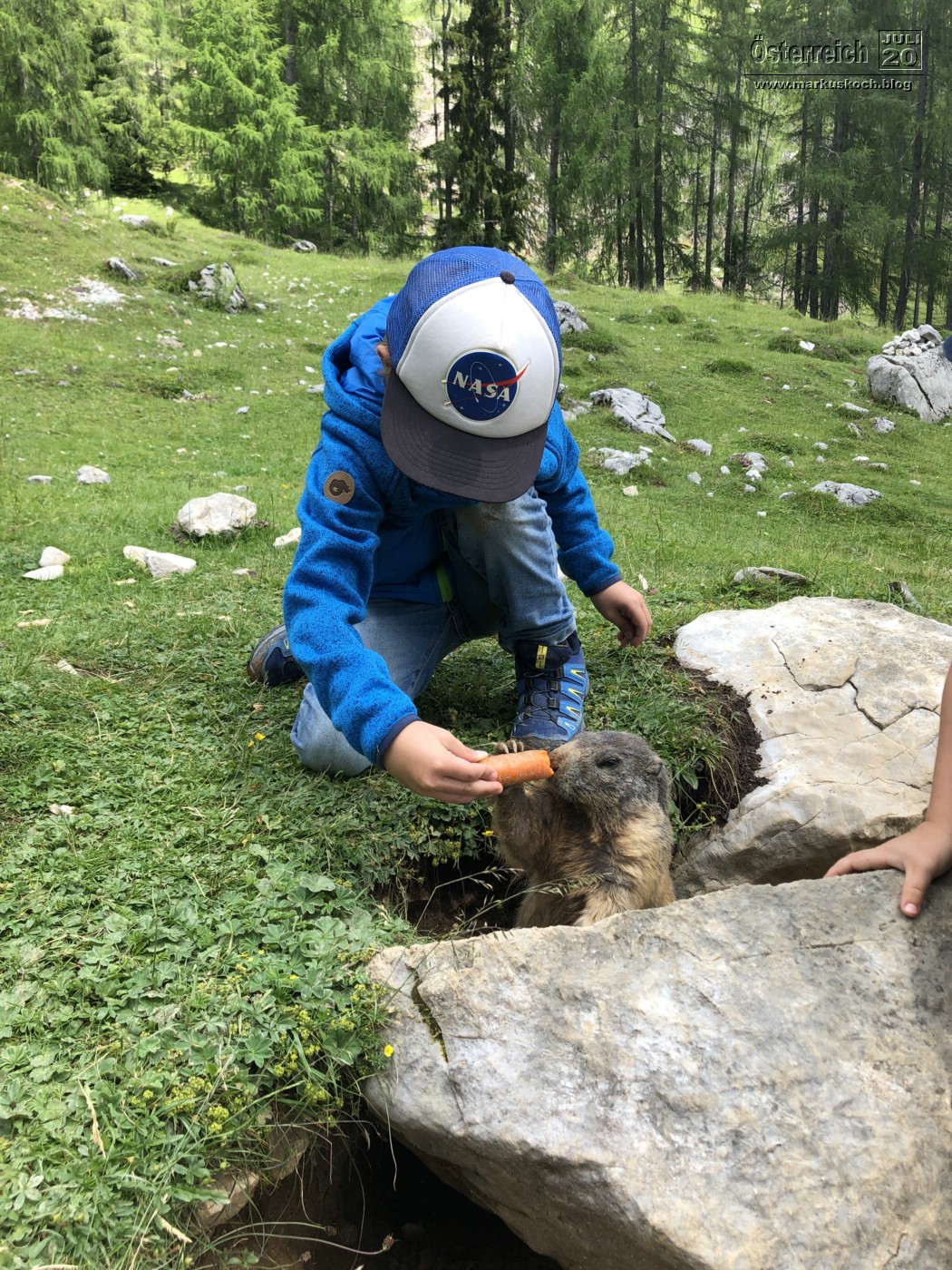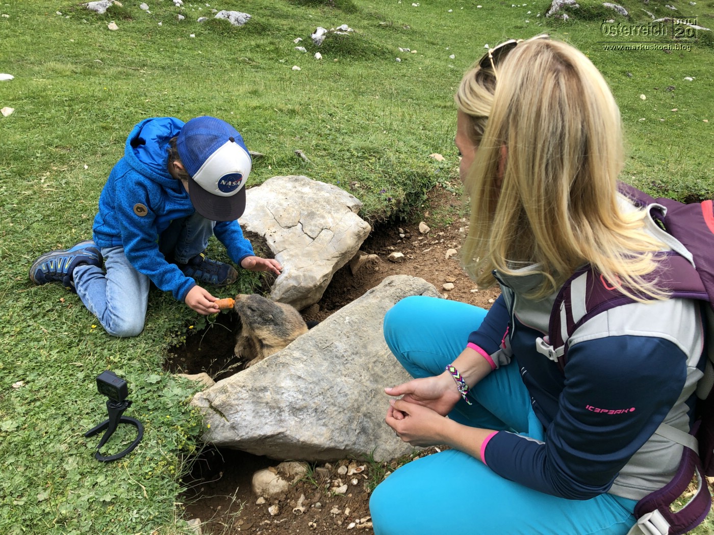 Ein paar Kilometer entfernt war der Wanderparkplatz zur Bachlalm hinauf. Dort konnte man viele zahme Murmeltiere bestaunen und füttern. Es war total süß mit diesen Tieren. Sogar Kleine waren zutraulich.