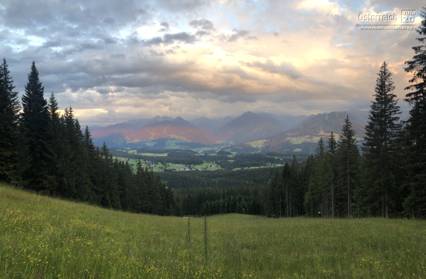 Nachmittags wanderte Marie den Berg hinauf und ich fuhr am Abend mit dem Fahrrad raus. Ein schöner letzter Abend in den Bergen mit Ausblick auf das Dachstein-Massiv.