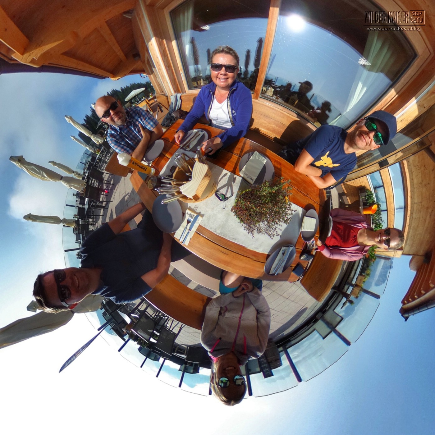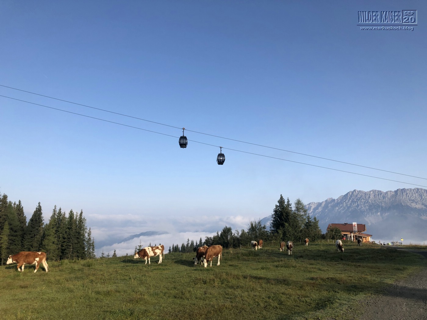 Da wieder so tolles Wetter gemeldet war, zog es Marie, Feli & mich wandernd zum Frühstücken, wo dann der Rest der Crew (Chris & Chrissi reisten am So schon ab) gondelte, auf den Hartkaiser wieder zur Kaiser Lounge hinauf. Runter ging es dann mit Zwischenstopp auf der Rübezahl Alm auch mit Kirstin zu Fuß.