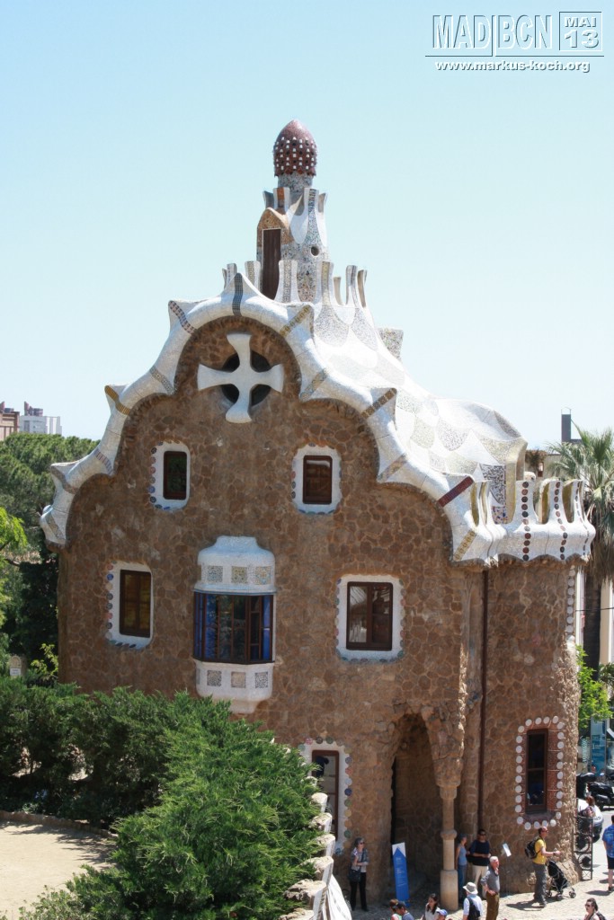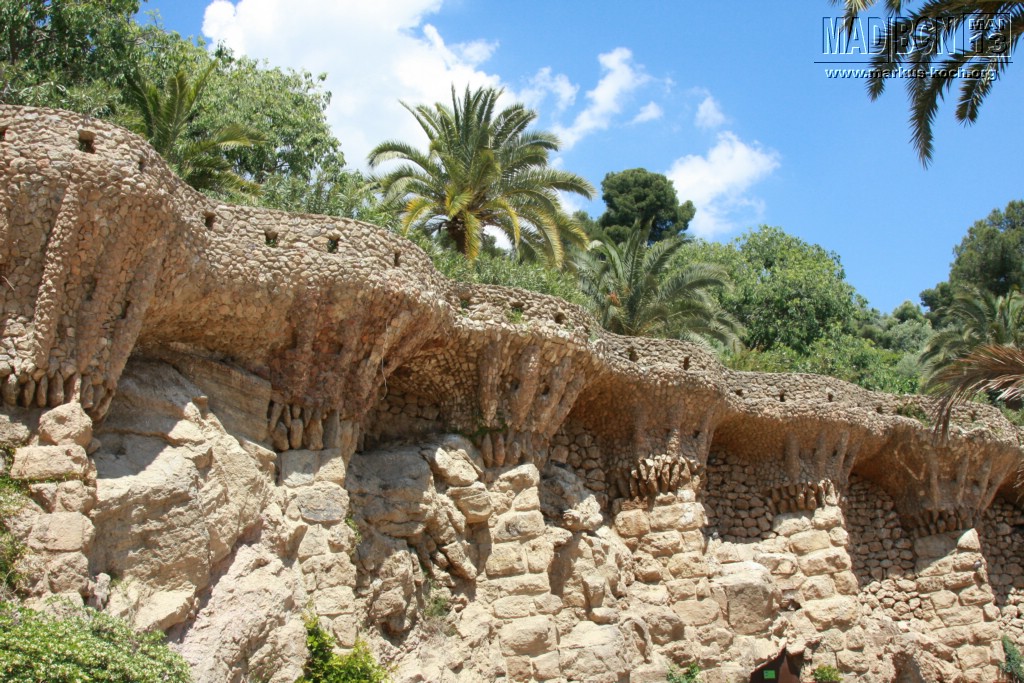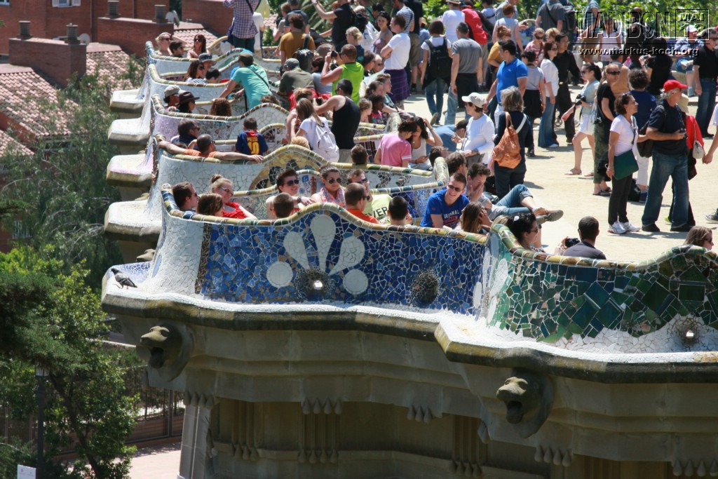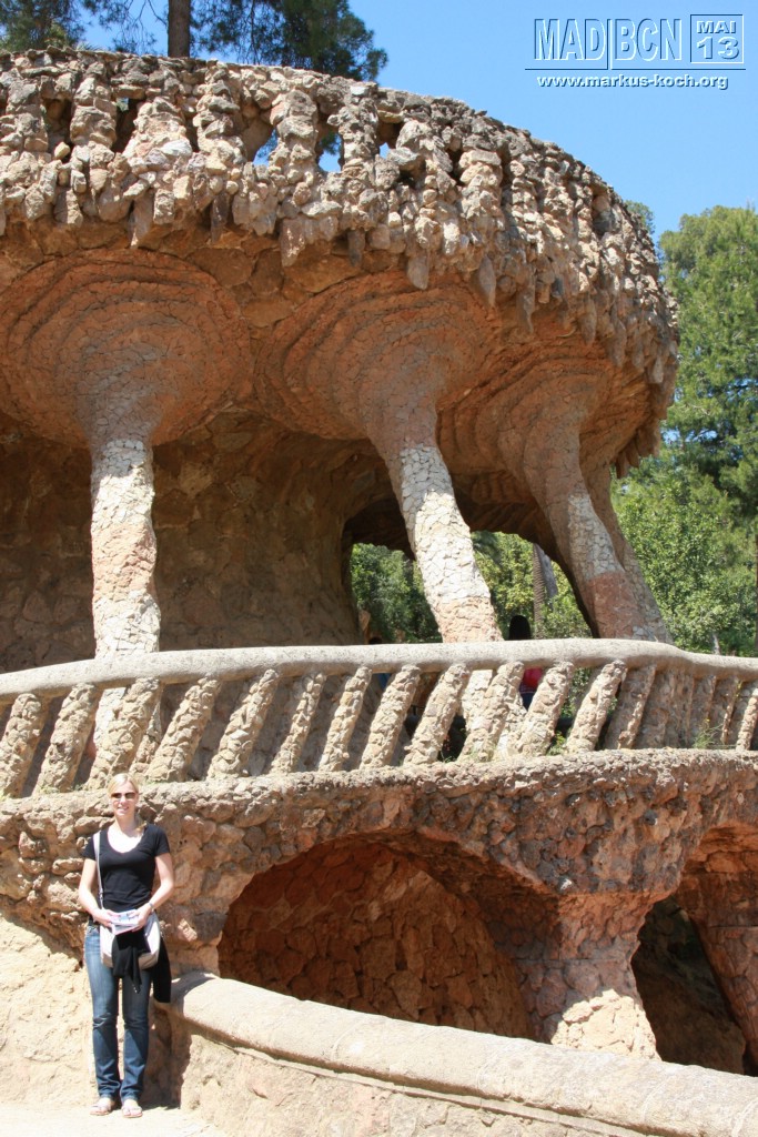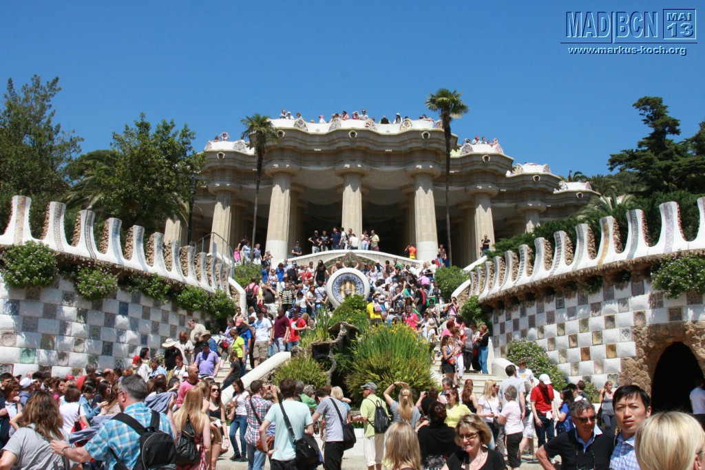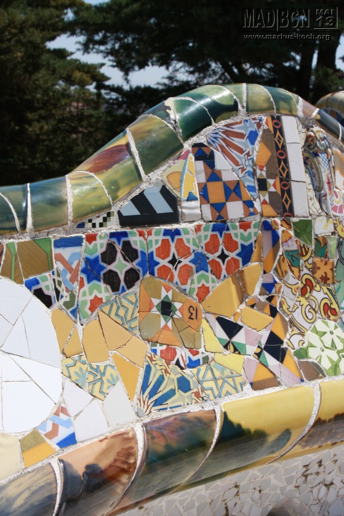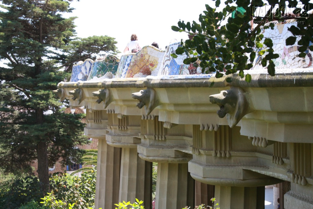 Zuerst steuerten wir – immer noch mit dem Auto – den Park Güell an. Ein verspielter Garten nach der Fantasie Gaudi. Gaudi ist ein irrer Künstler mit sehr viel Einfallsreichtum gewesen, was man auch schon im Park Güell sehen kann. Das ganze Areal mit Mosaiken verzierten Skulpturen, einen Säuleneingang, der als Markthalle gedacht war, und die berühmte Schlangenbank (150m lang).