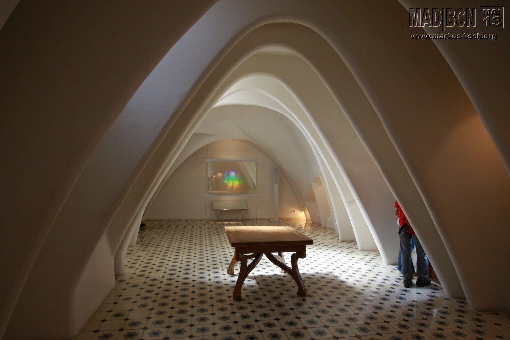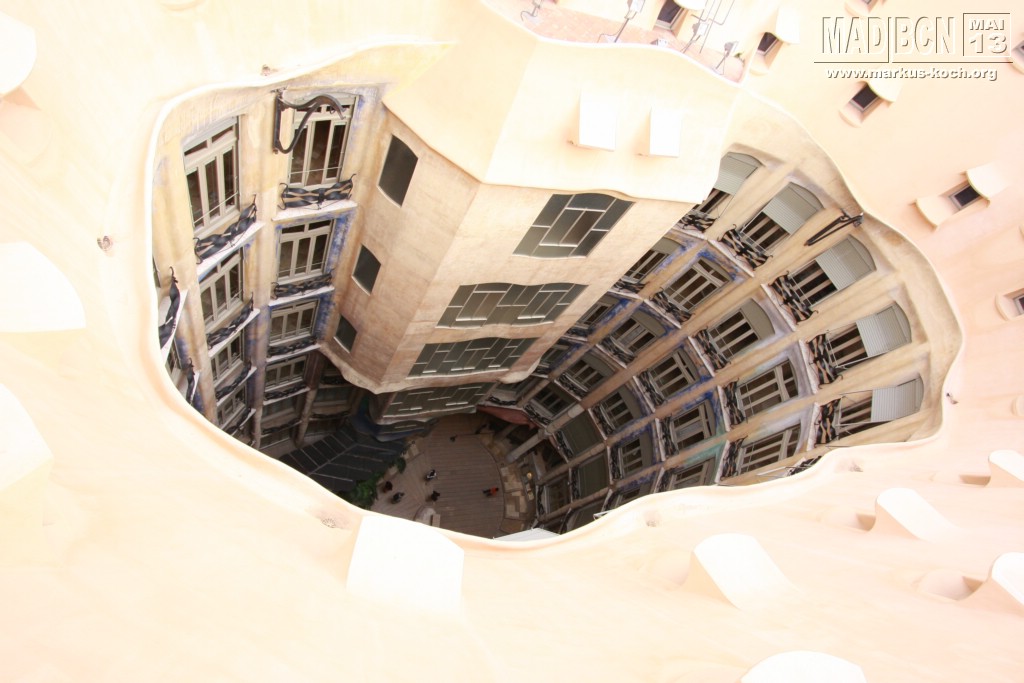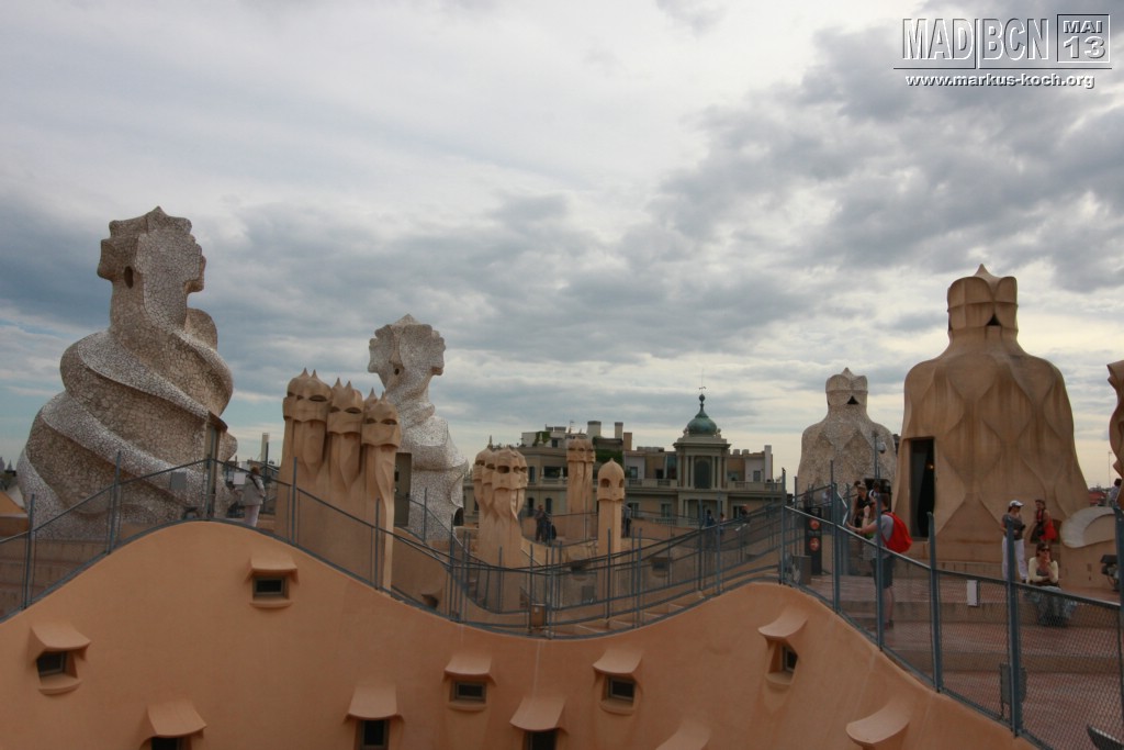 Casa Milá – ein weiteres Meisterwerk eines Wohnhauses von Gaudi. Auf der Dachterrasse installiert er eine Serie der für ihn charakteristischen Kamine und Lüftungsschächte. Ein Stockwerk tiefer eine interessante Wohnung.