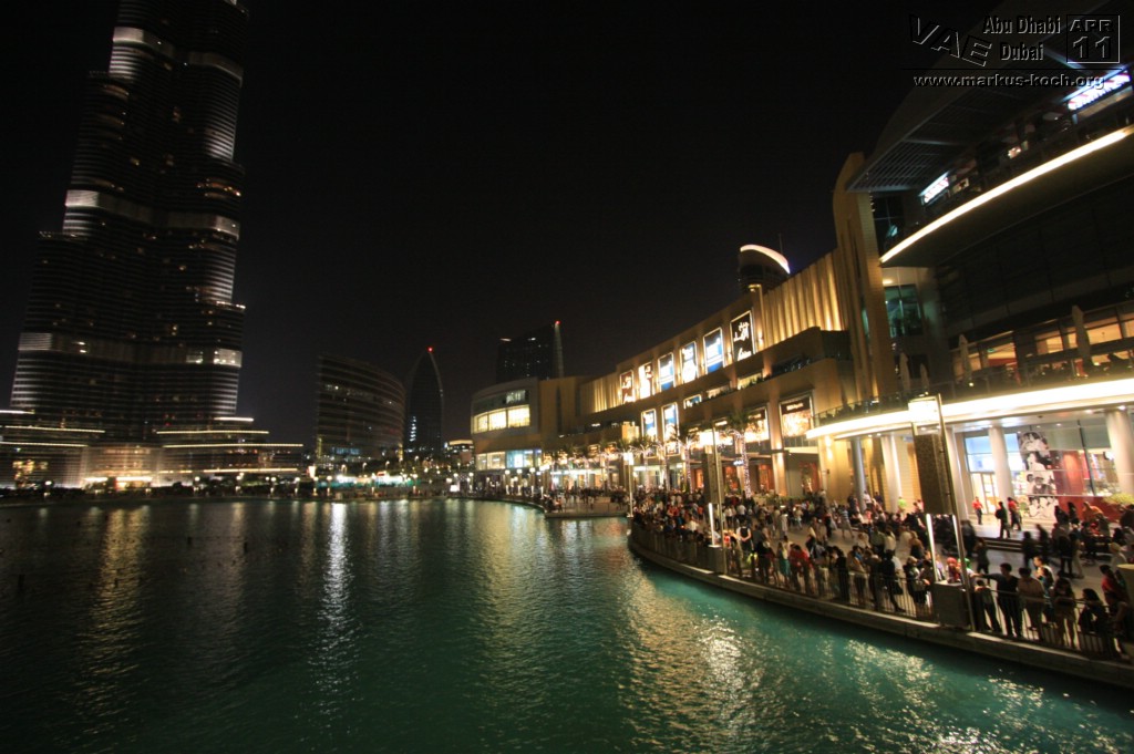 Im Außenbereich der Mall war ähnlich wie vor dem Bellagio in Las Vegas ein sehr großer Wasserbereich in dem nach dem Takt der Musik ständig zwischen 18 und 23 Uhr Wasserfontänen direkt unterhalb des Burj Khalifa in die Luft „geschossen“ werden. Echt gut gemacht. Diese Fontänen (The Fountains) sieht man auch gut aus 452 Metern oberhalb.