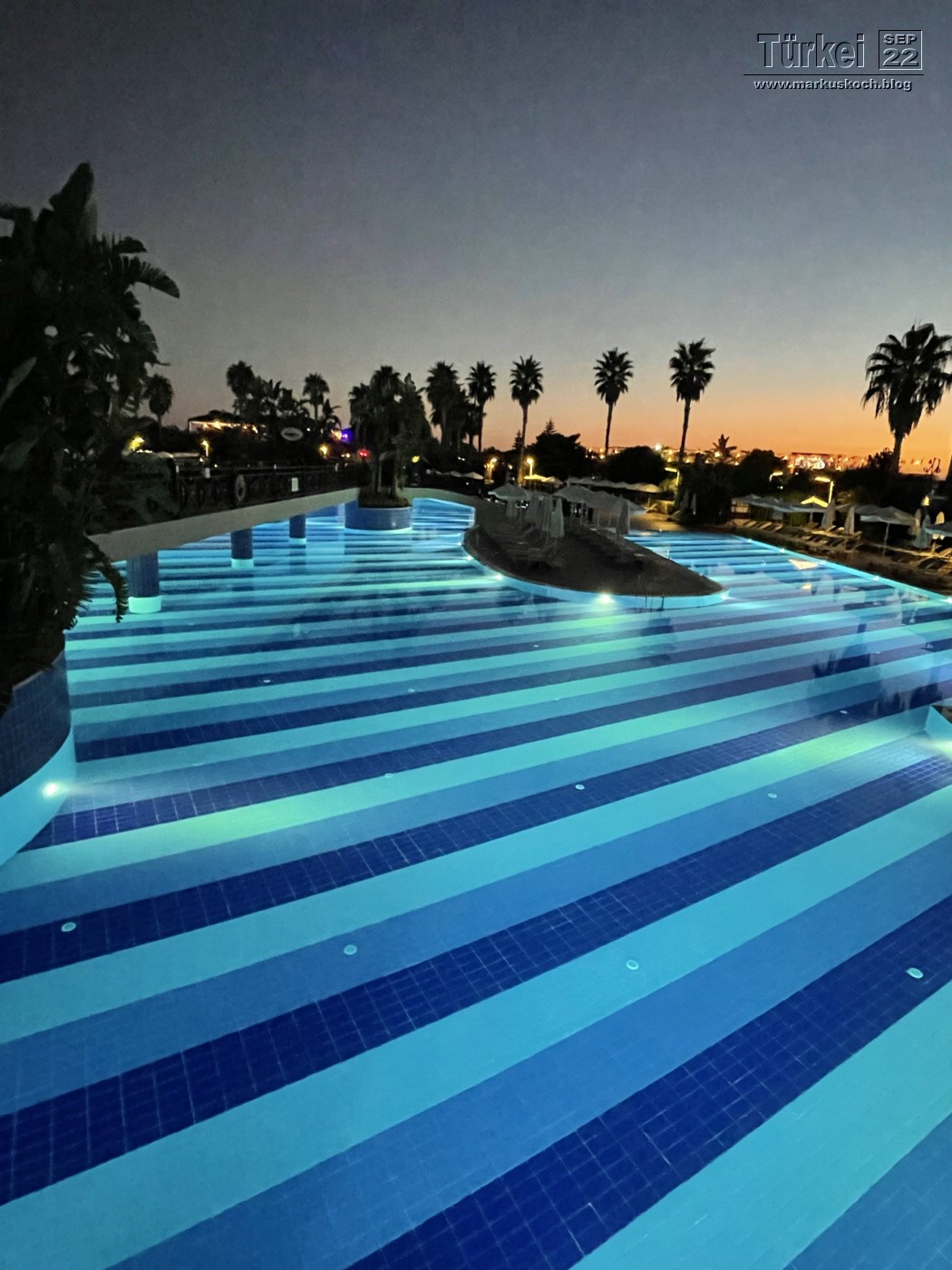 Die Pools waren abends auch schön anzusehen. Jedoch war im Eingangsbereich wieder diese irre laut & klirrende Musik. Das hat schon etwas genervt, weil es einfach nicht stimmig war. Dann gings auch schon ins Bett.