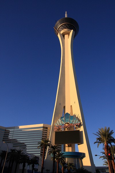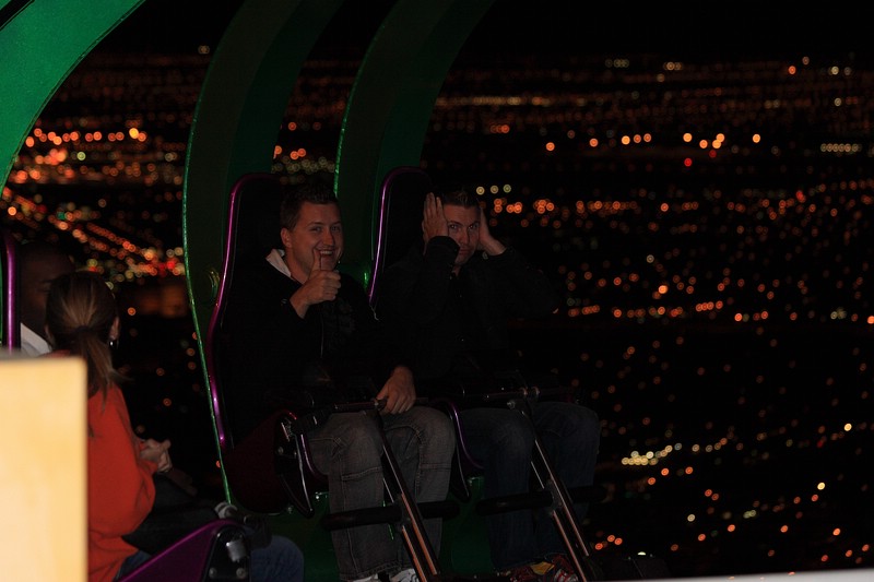 Nach der Mittagspause sind wir mit dem Auto zum Stratosphere Tower gefahren. Oben angekommen konnten wir den Sonnenuntergang über Las Vegas inkl. Vollmondblick genießen. Tommy und ich haben uns für zwei Fahrgeschäfte dort oben entschieden. Das eine war wie am Volksfest eher unspäktakulär, auch wenn es fast den Magen umgedreht hätte. Es war der Big Shot, der in mitten auf Spitze des über 300m hohen Towers uns nach oben und dann noch schneller gen Erdboden katapultiert hat. Noch besser war dann aber das Insanity. MIt dem Teil wurde man frei schwebend vom Tower über den Erdboden befördert. Dieser Ride drehte sich dann auch noch immer schneller, was einem dann endgültig den Magen umdrehte – einfach gigantisch und unbeschreiblich.